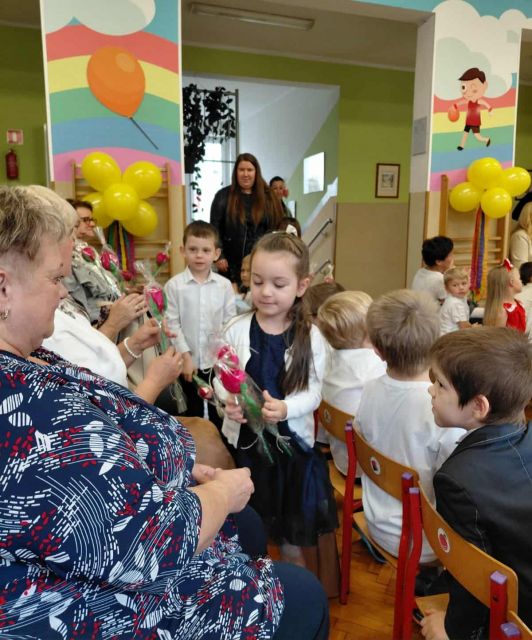 Dzieci z grupy „Smerfy” zaprezentowały piękne wierszyki, które wprowadziły wszystkich w uroczysty i radosny nastrój. Wystąpił również chór przedszkolny „Karmelek”, który przygotował taniec oraz piosenki związane z tematyką święta.