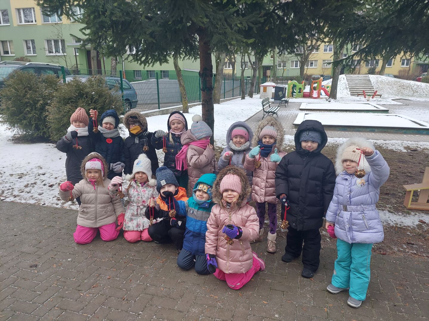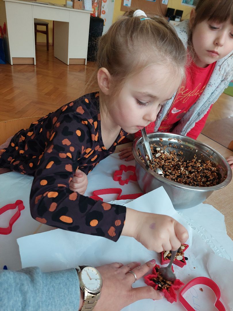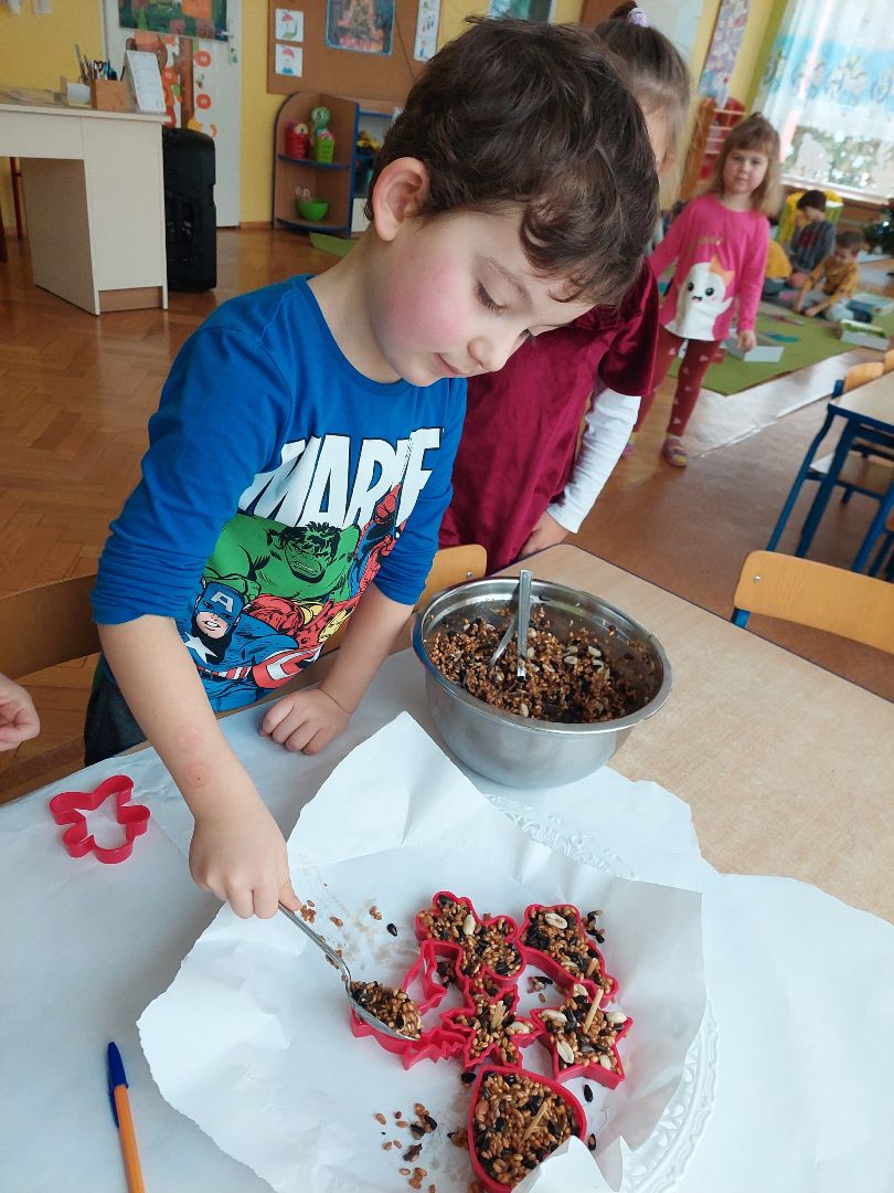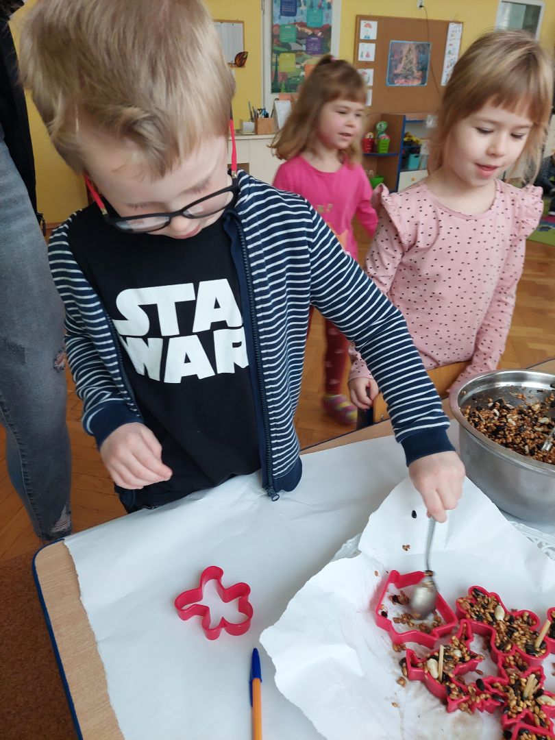 Na zajęciach edukacyjnych dzieci zrobiły zawieszki z ziaren dla ptaków na zimę.