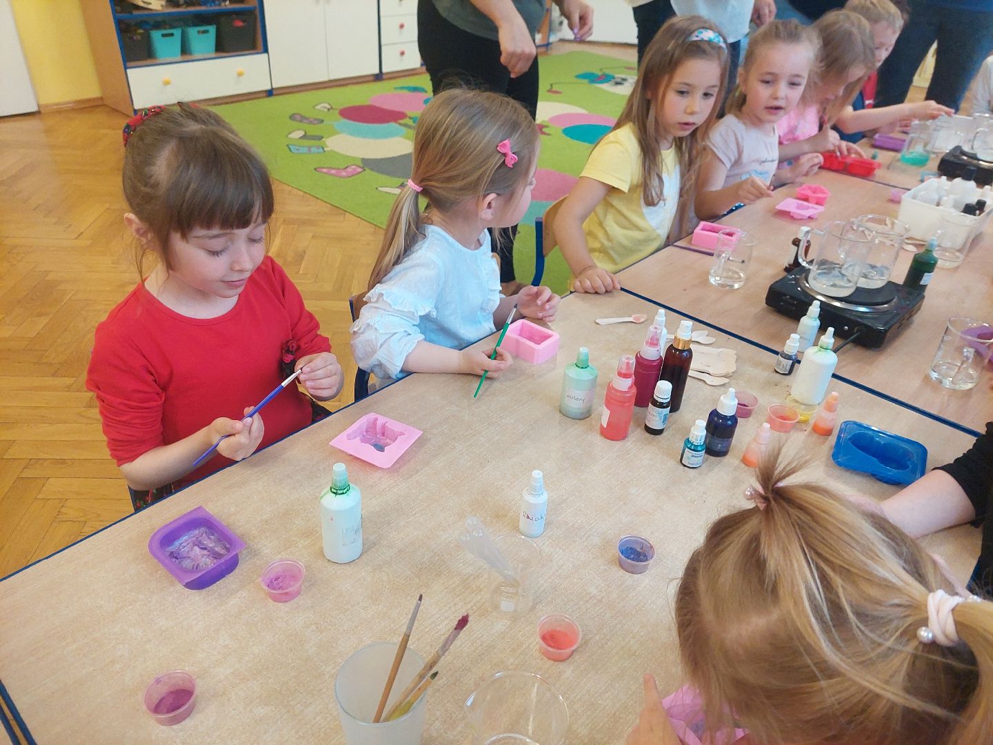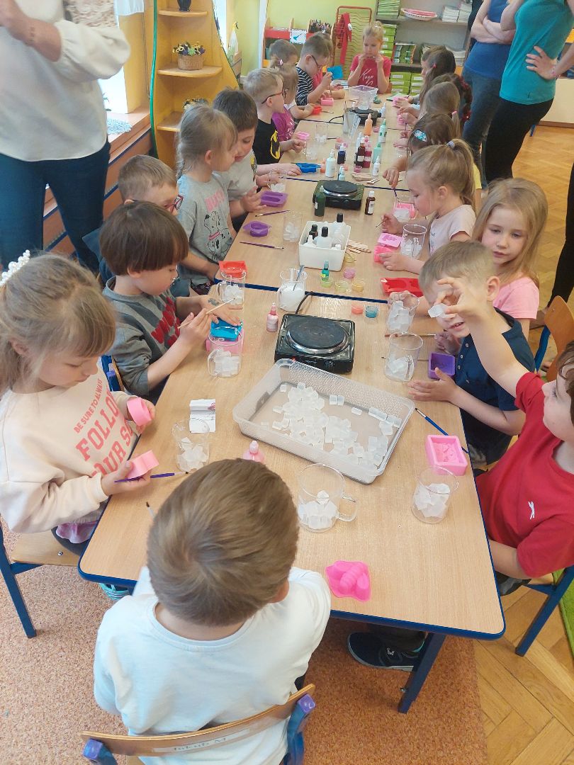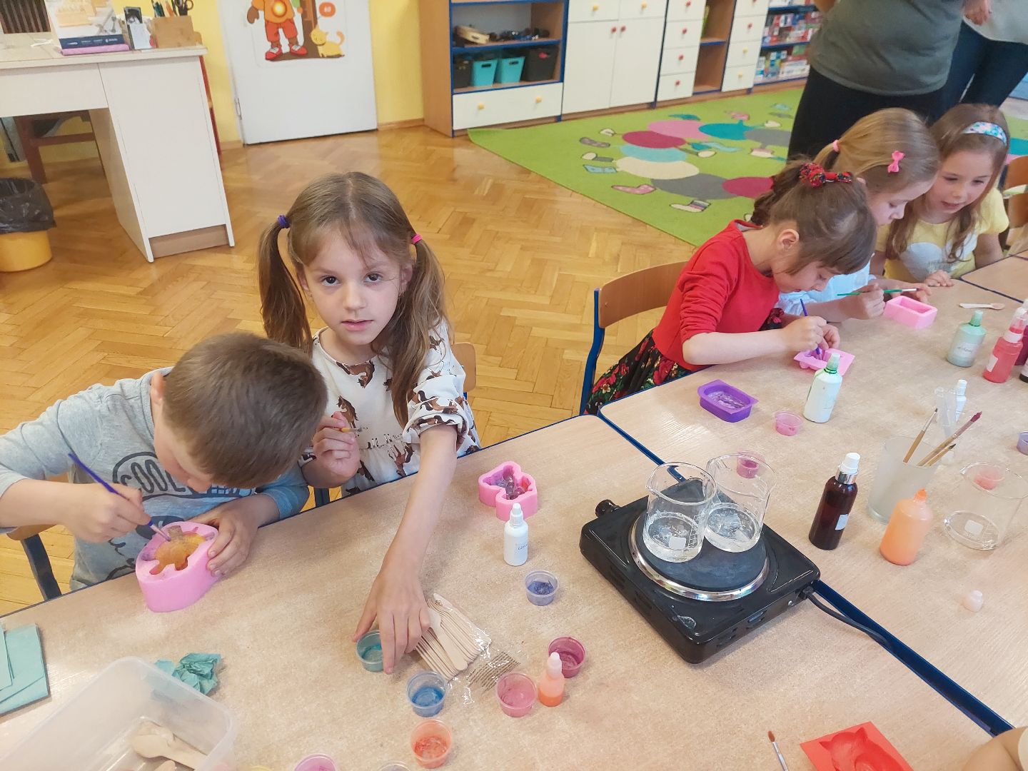Dzieci uczestniczyły w warsztatach z robienia mydełek. Wszystkie z zaangażowaniem i ciekawością wykonywały swoje zadania i wykonały samodzielnie mydelko według wybranego kształtu, koloru i zapachu.