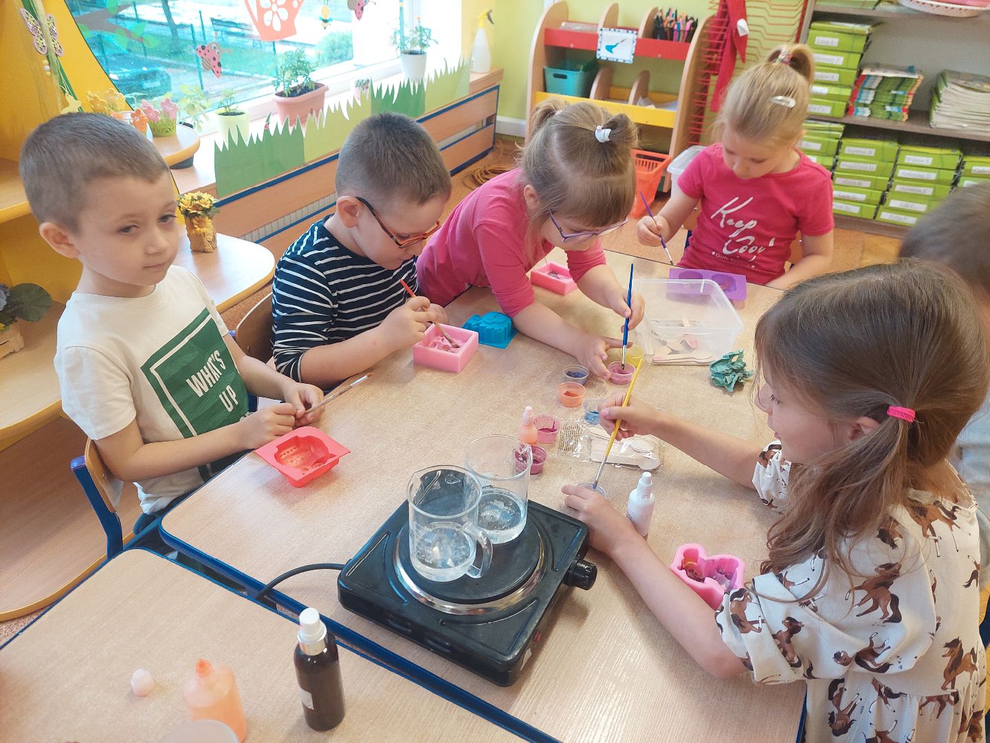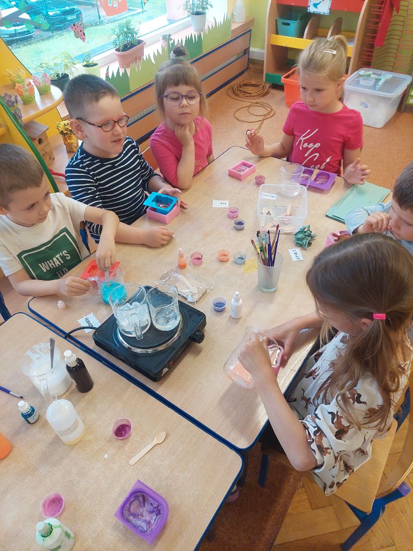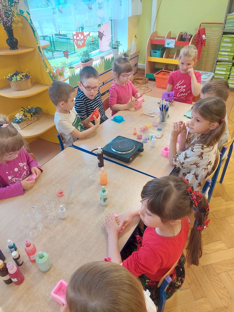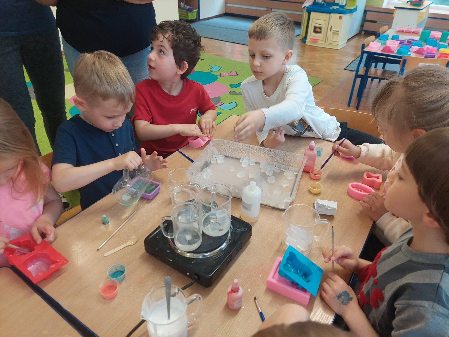 Dzieci uczestniczyły w warsztatach z robienia mydełek. Wszystkie z zaangażowaniem i ciekawością wykonywały swoje zadania i wykonały samodzielnie mydelko według wybranego kształtu, koloru i zapachu.