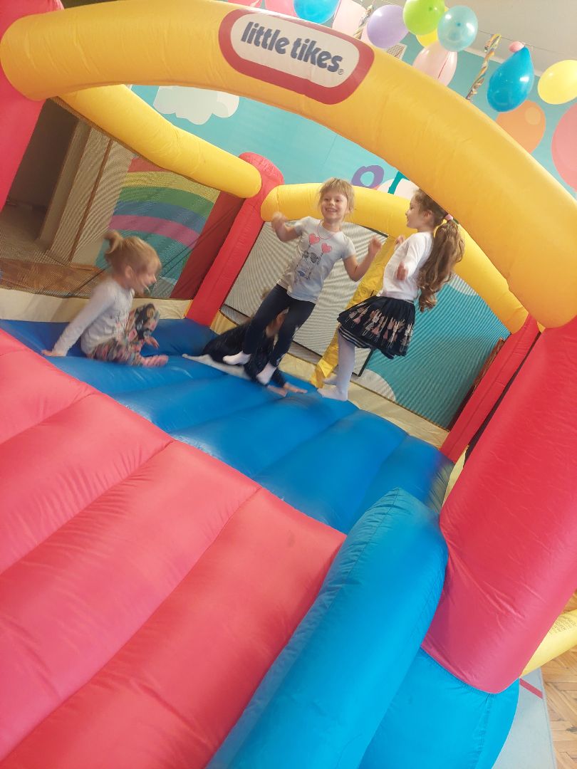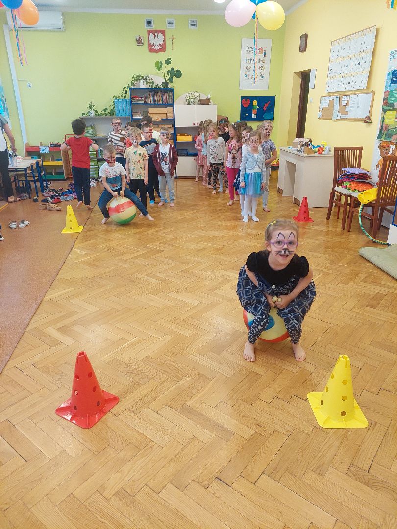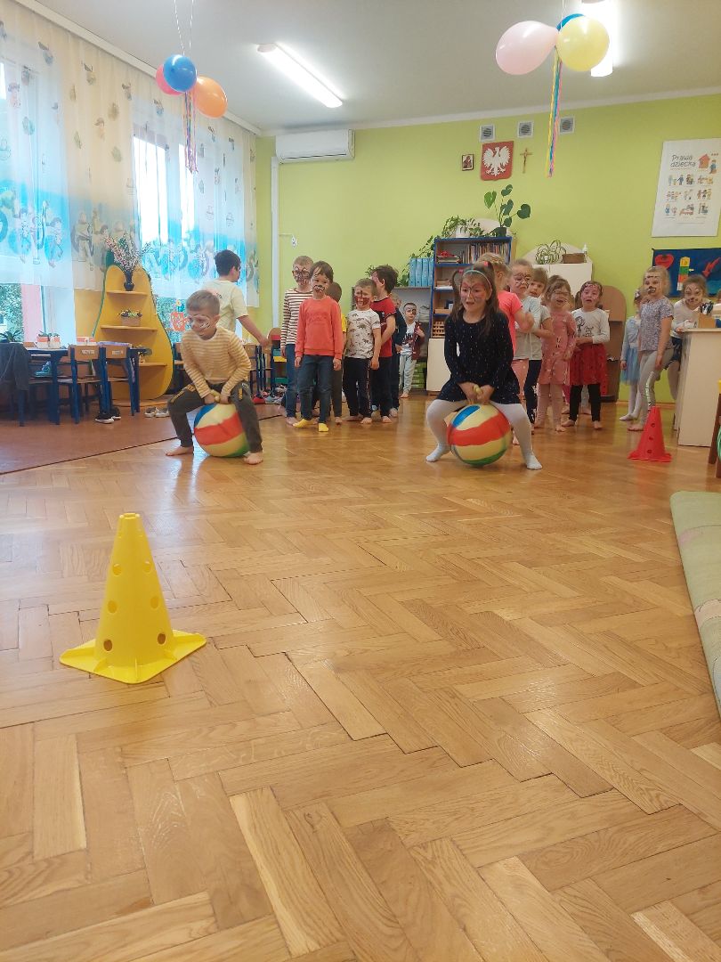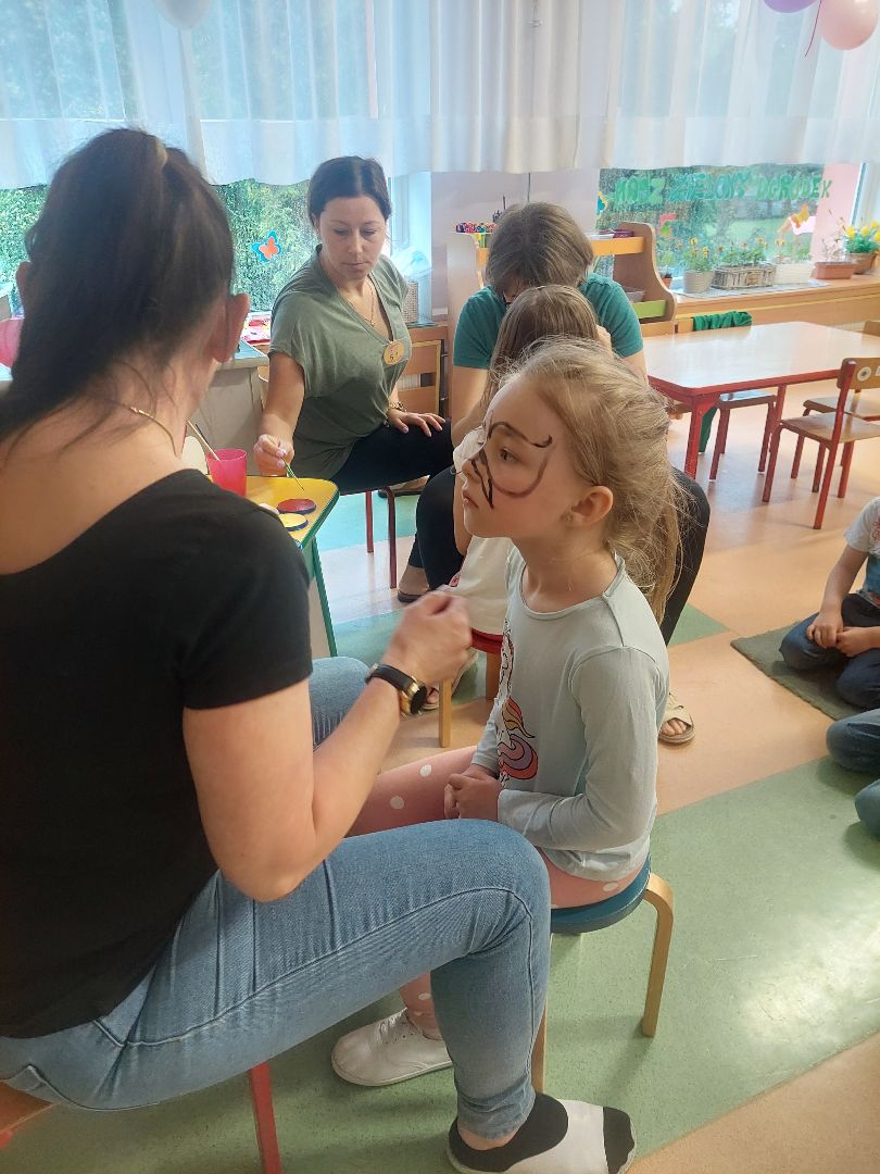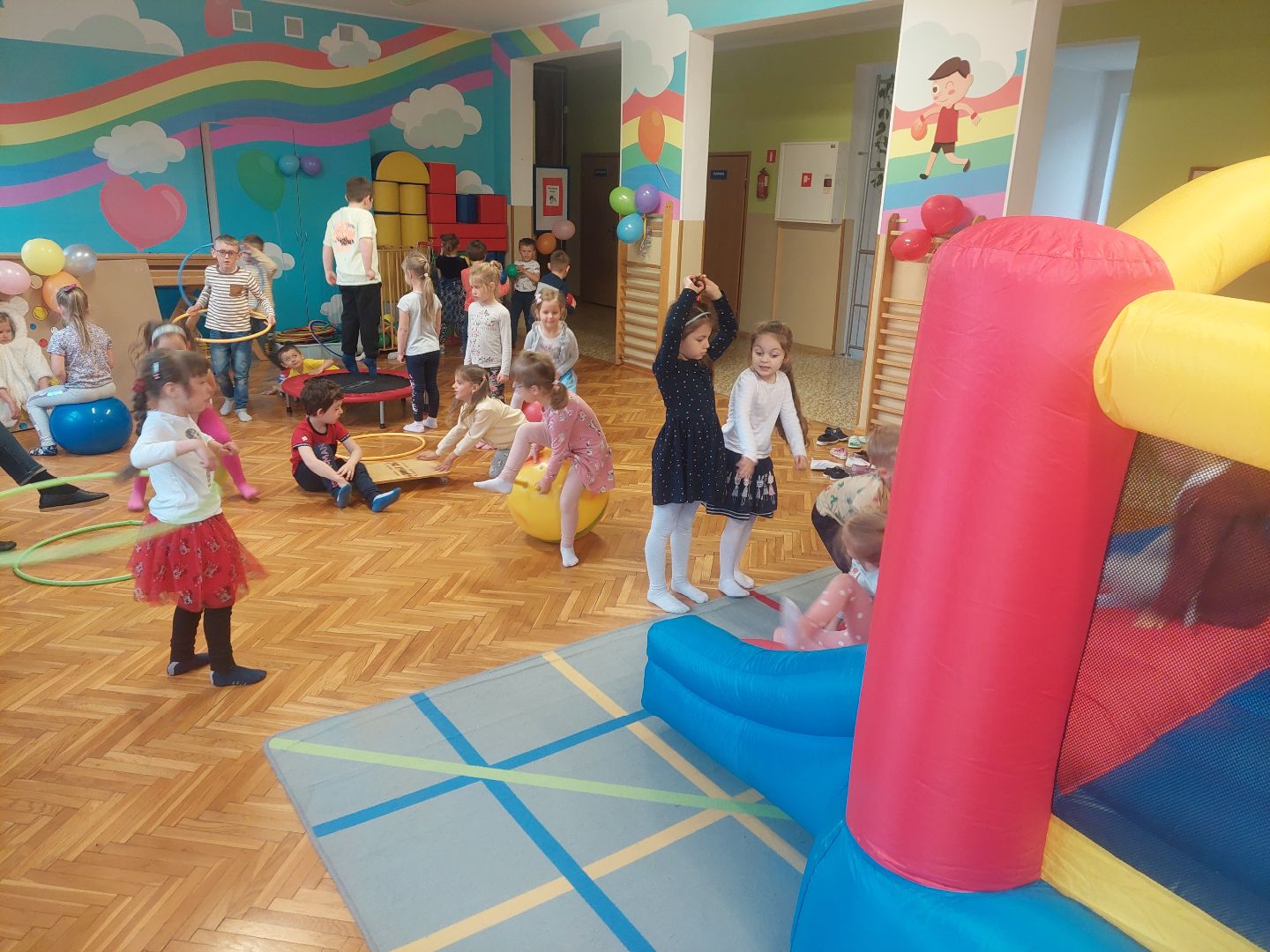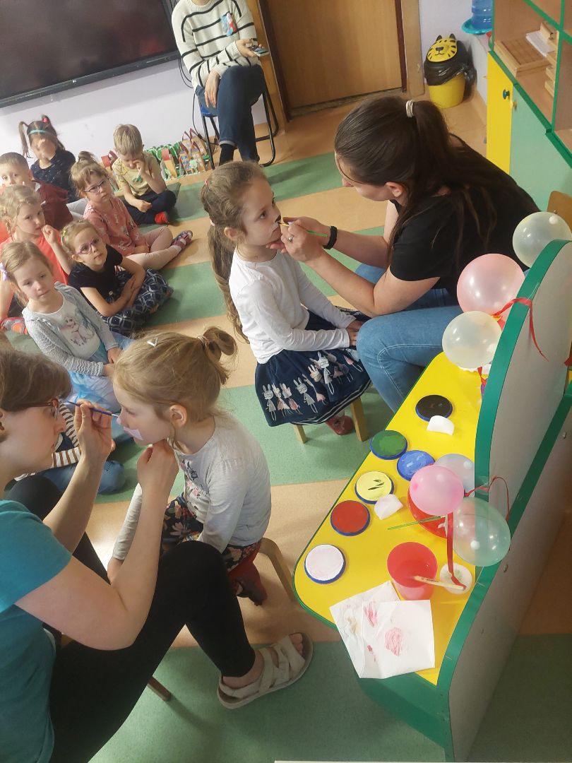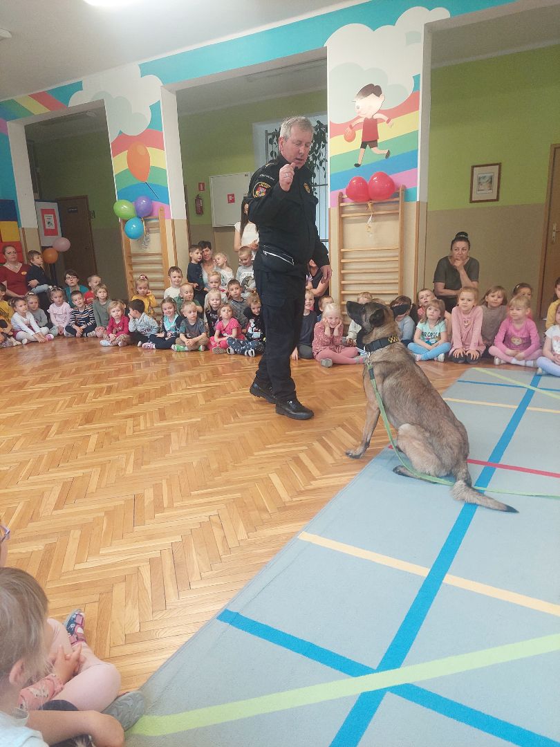 Dzień 1. Dzieci odwiedziła straż miejska z psem. Dzieci dowiedziały się jak należy zachować się w obecności psa oraz oglądały pokaż psich komend. Kolejna atrakcją były zabawy zorganizowane w przedszkolu: dyskoteka, dmuchaniec, trampolina, fotobudka, zabawy z chusta animacyjna i Darami Froebla, malowanie twarzy oraz konkurencję sportowe.