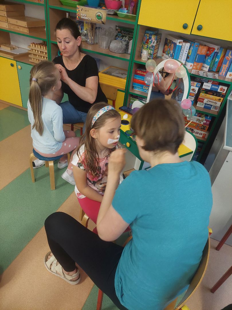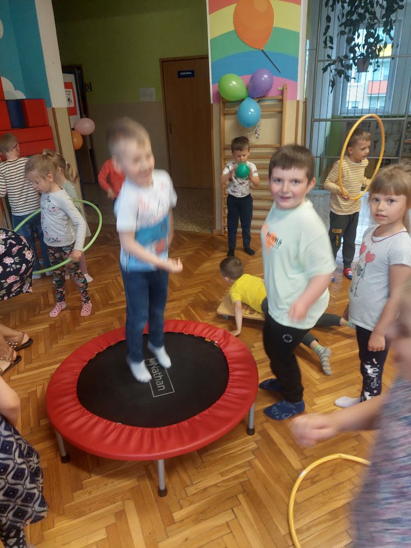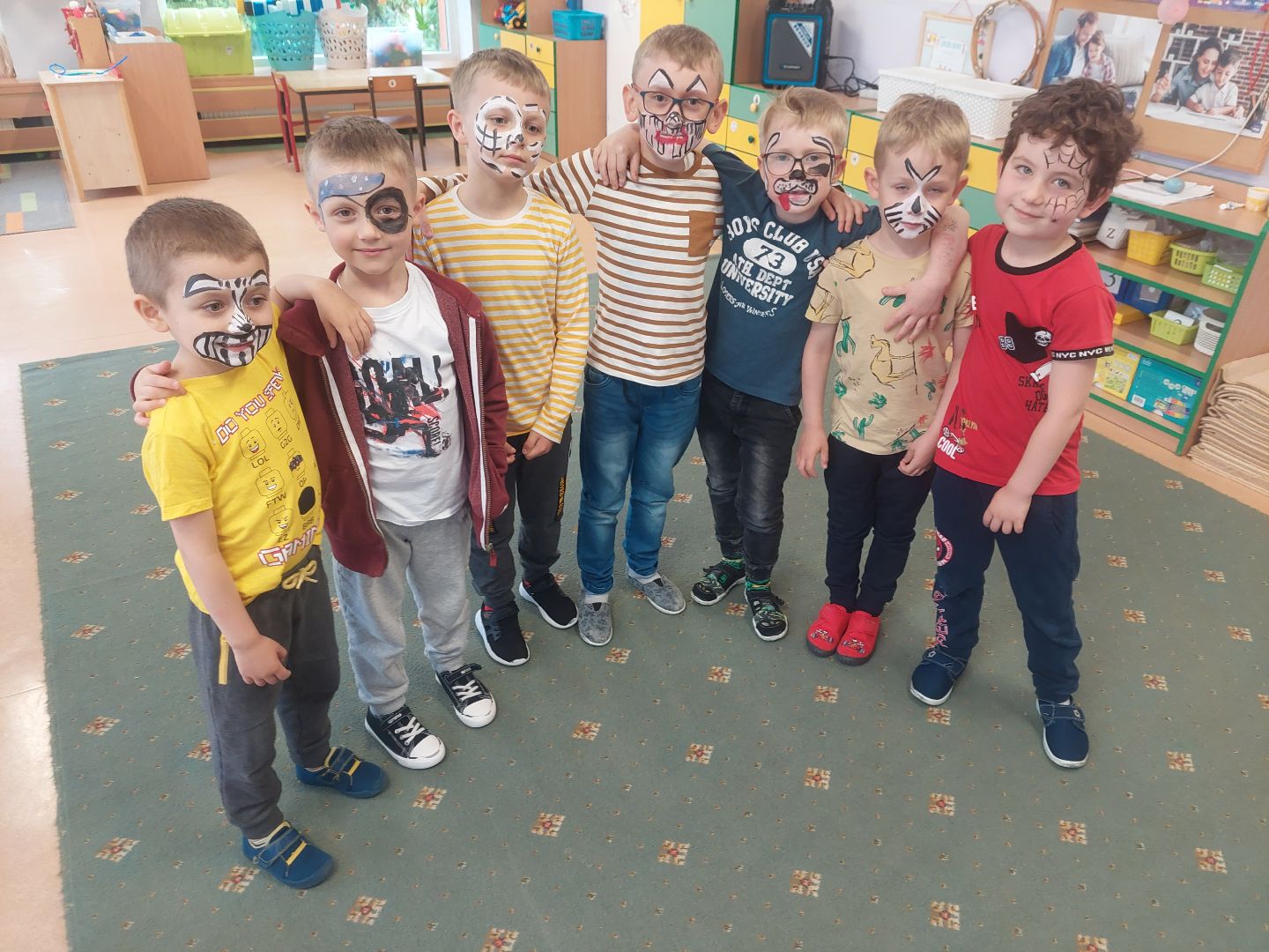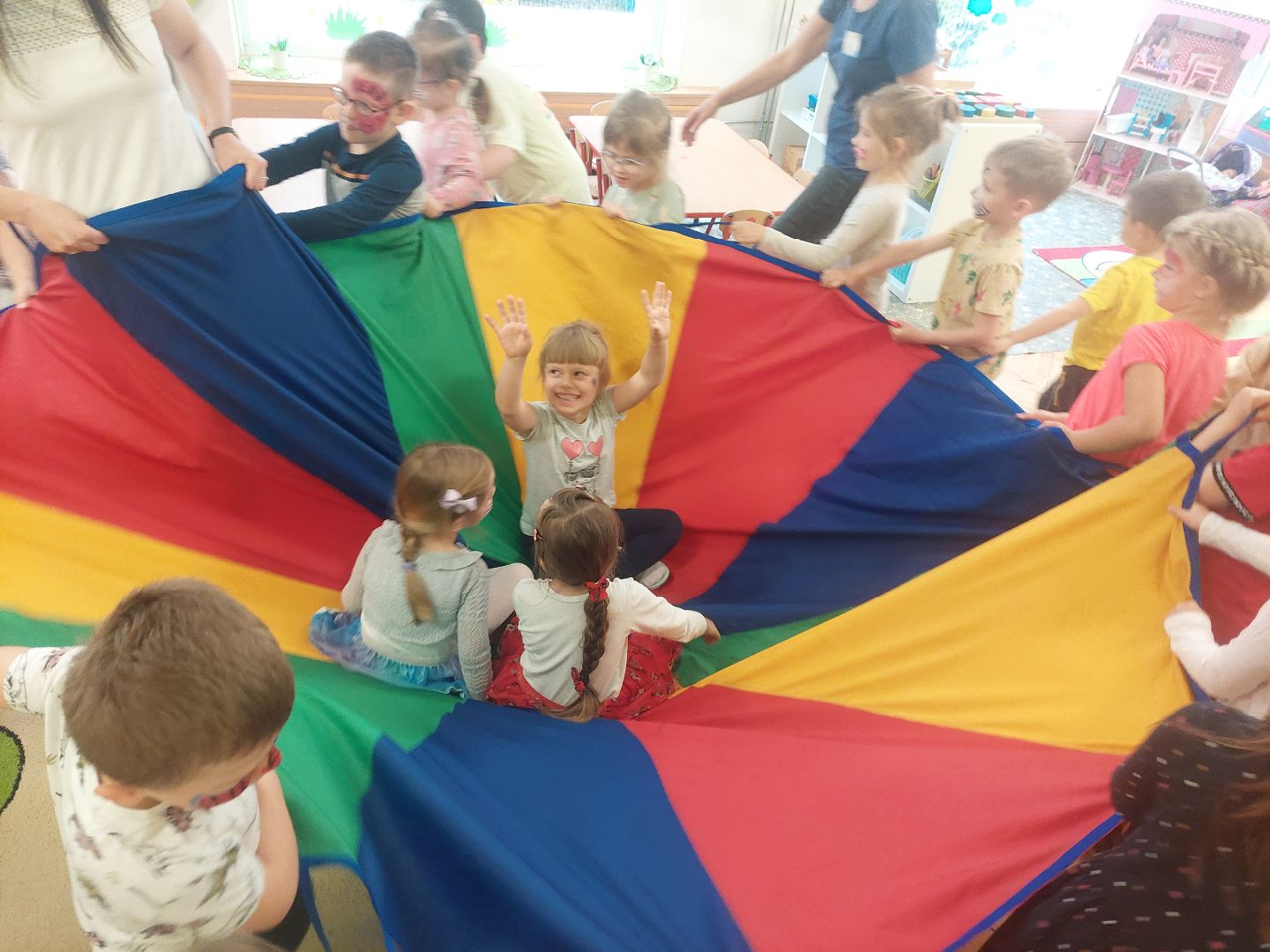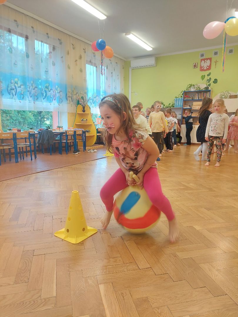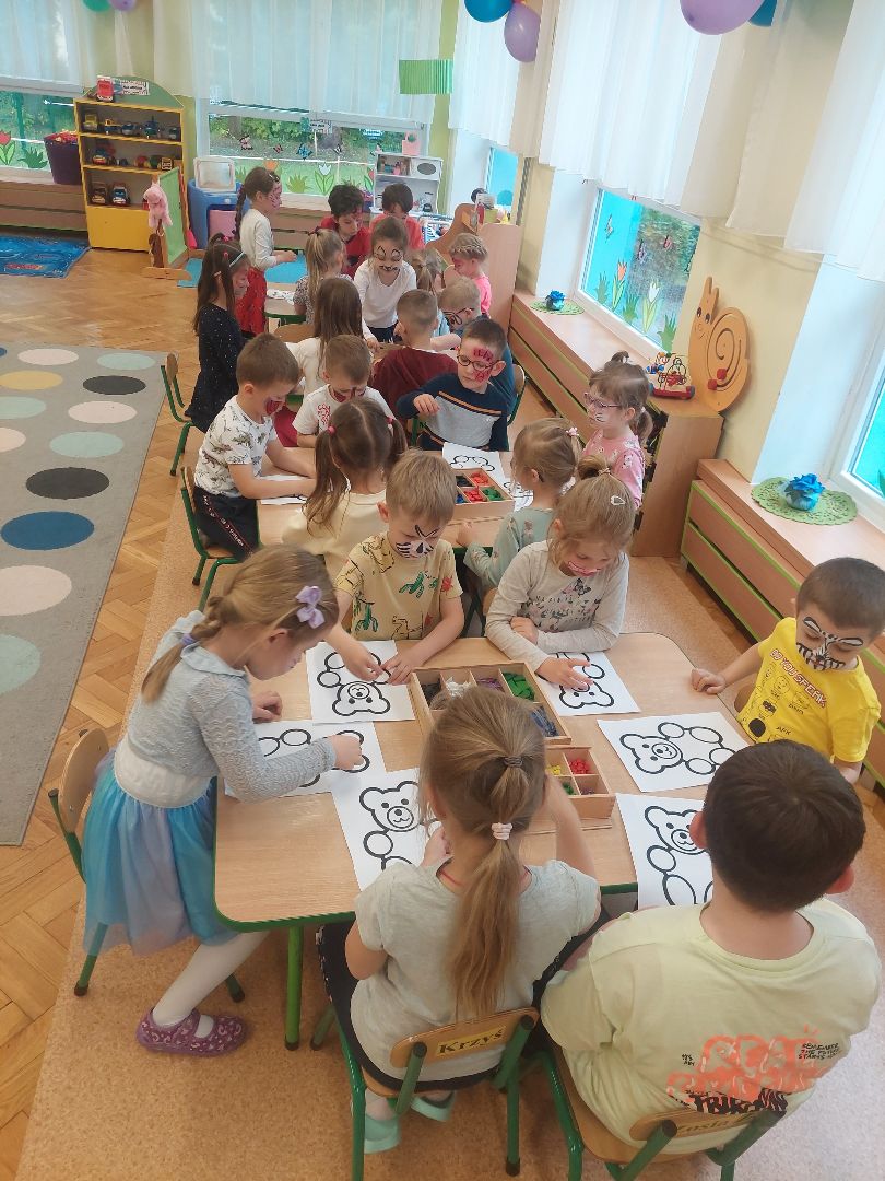 Dzień 1. Dzieci odwiedziła straż miejska z psem. Dzieci dowiedziały się jak należy zachować się w obecności psa oraz oglądały pokaż psich komend. Kolejna atrakcją były zabawy zorganizowane w przedszkolu: dyskoteka, dmuchaniec, trampolina, fotobudka, zabawy z chusta animacyjna i Darami Froebla, malowanie twarzy oraz konkurencję sportowe.