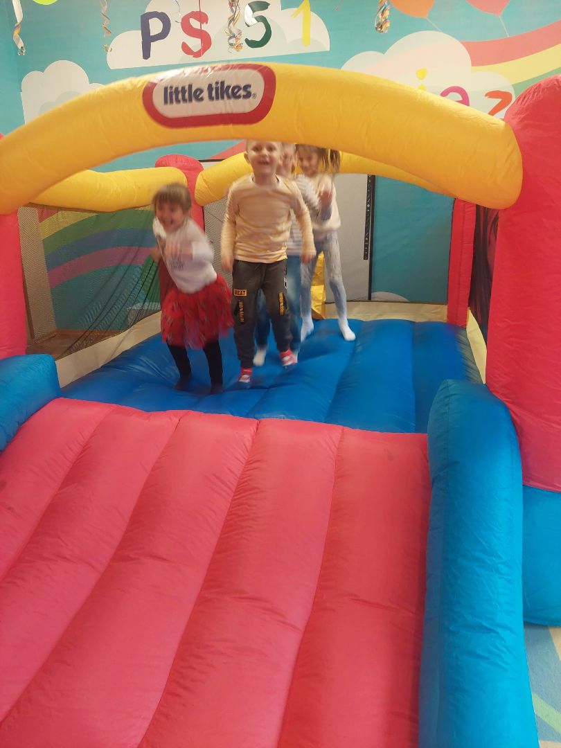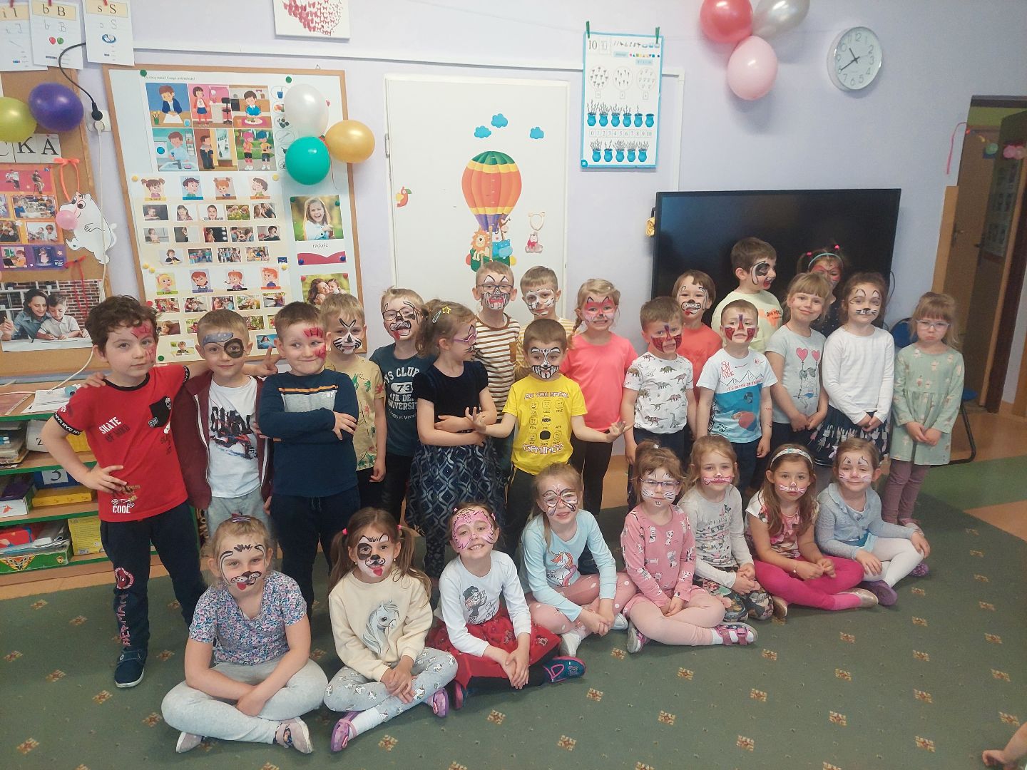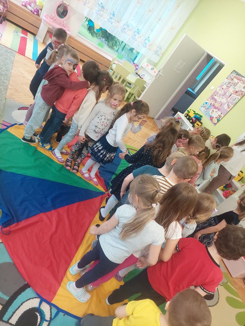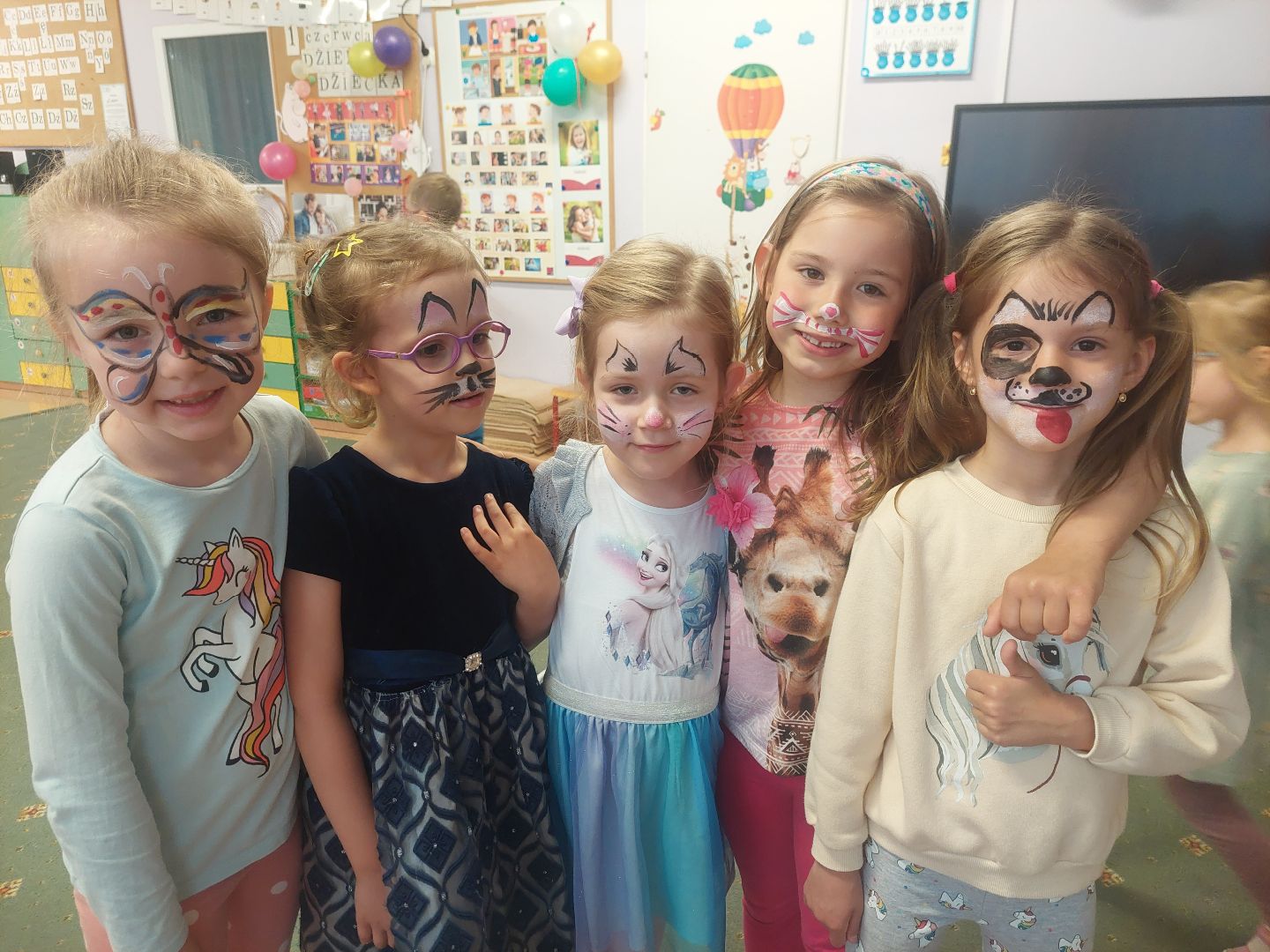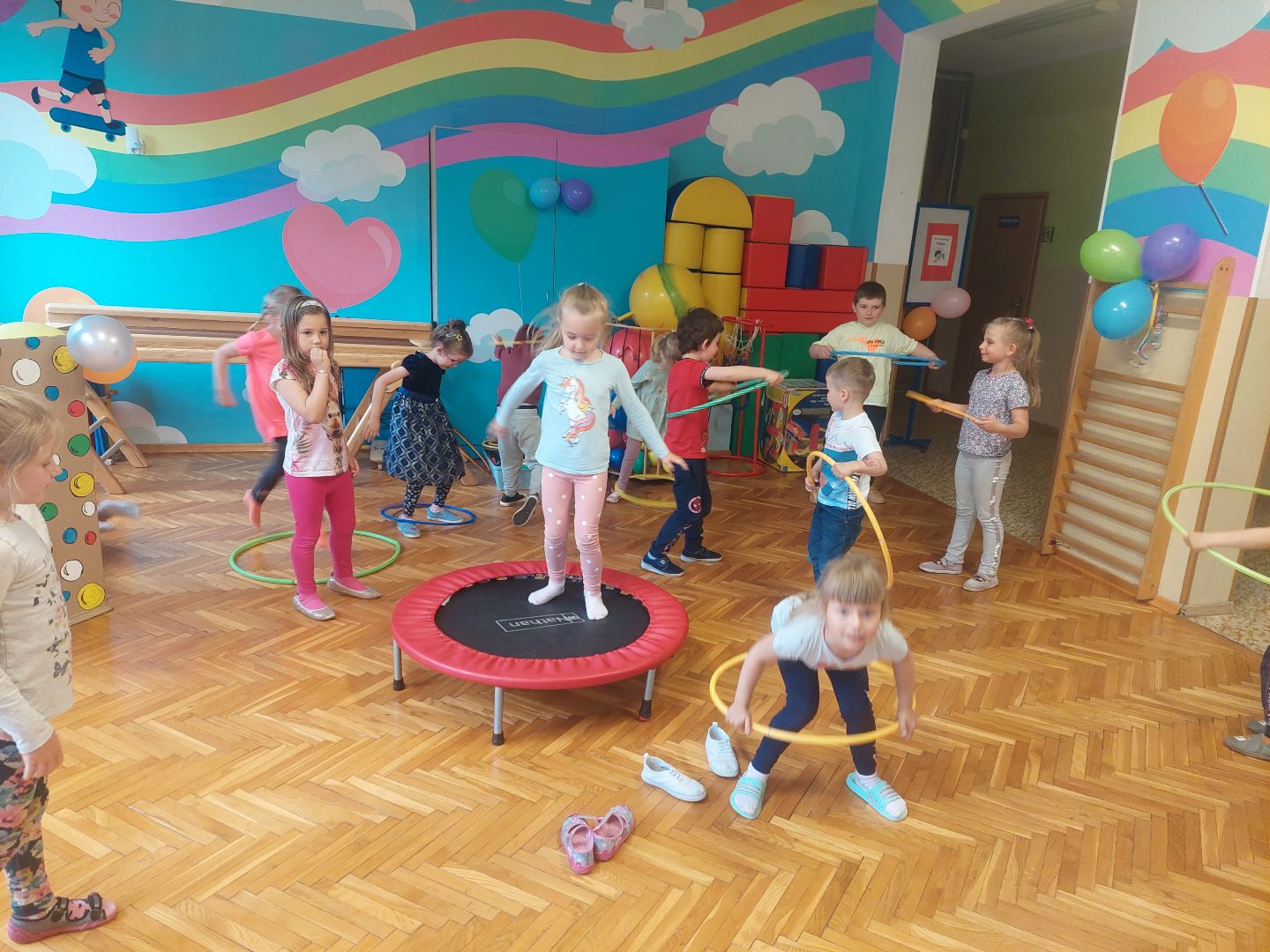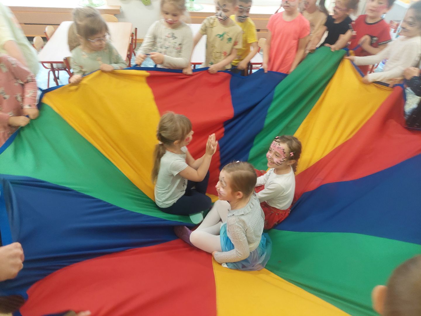 Dzień 1. Dzieci odwiedziła straż miejska z psem. Dzieci dowiedziały się jak należy zachować się w obecności psa oraz oglądały pokaż psich komend. Kolejna atrakcją były zabawy zorganizowane w przedszkolu: dyskoteka, dmuchaniec, trampolina, fotobudka, zabawy z chusta animacyjna i Darami Froebla, malowanie twarzy oraz konkurencję sportowe.