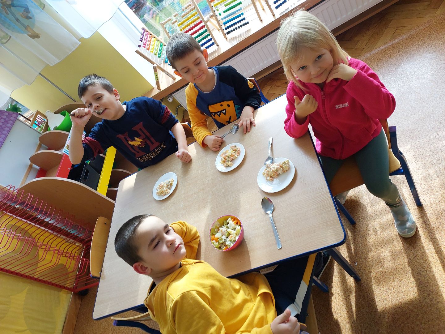 Jesień to pora zbierania warzyw z ogrodu. Z myślą o jarzynowych witaminach, Krasnoludki postanowiły wspólnie zrobić pyszną sałatkę warzywną. Przyrządzanie sałatki dało Krasnoludkom wiele radości i satysfakcji z samodzielnie wykonanego dania, bo taka potrawa smakuje wyśmienicie. Była to również okazja do rozmowy na temat zachowań prozdrowotnych i konieczności jedzenia warzyw i ich wpływu na nasze zdrowie