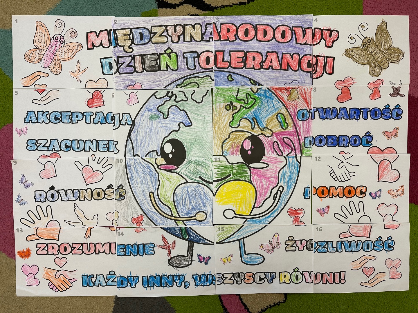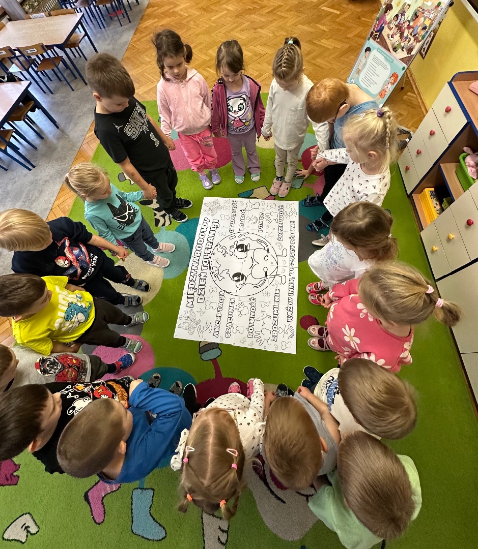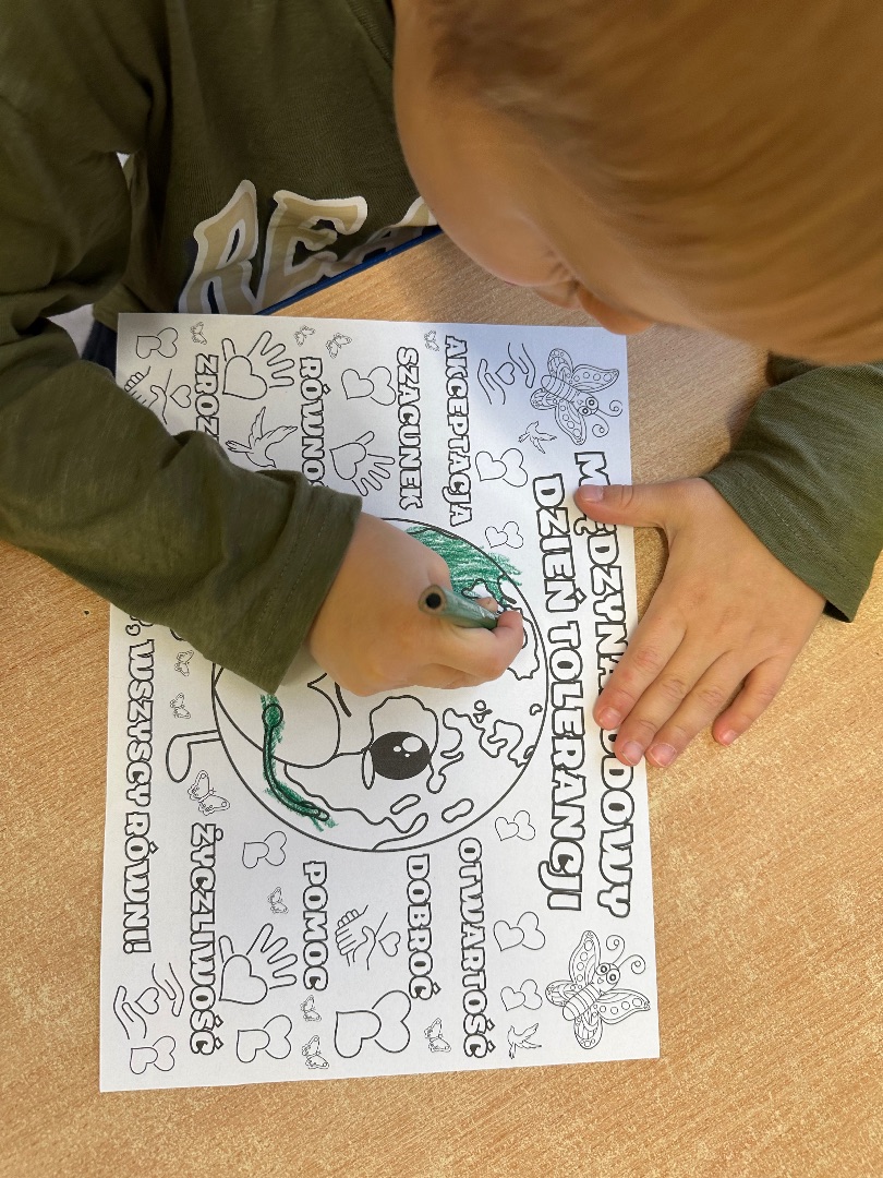W dniu dzisiejszym obchodziliśmy Międzynarodowy Dzień Tolerancji. Promujemy w ten sposób szacunek, akceptację i uznanie bogactwa różnorodności kultur na świecie. W grupie zostały przeprowadzone zajęcia przez pedagoga specjalnego Joannę Lipnicką, podczas których dzieci uczyły się prawidłowych postaw społecznych, akceptowania odmienności innych ludzi, poszanowania cudzej godności oraz uczuć.