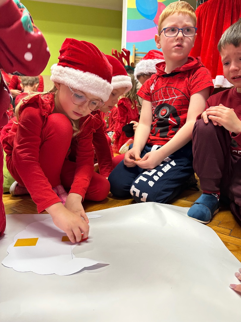 Zabawę rozpoczęliśmy wspólnymi tańcami, które udowodniły, że energia dzieci zdecydowanie przewyższa moc sań Mikołaja. W trakcie zabaw mikołajkowych okazało się, że każdy przedszkolak potrafi być „pomocnikiem Mikołaja”.