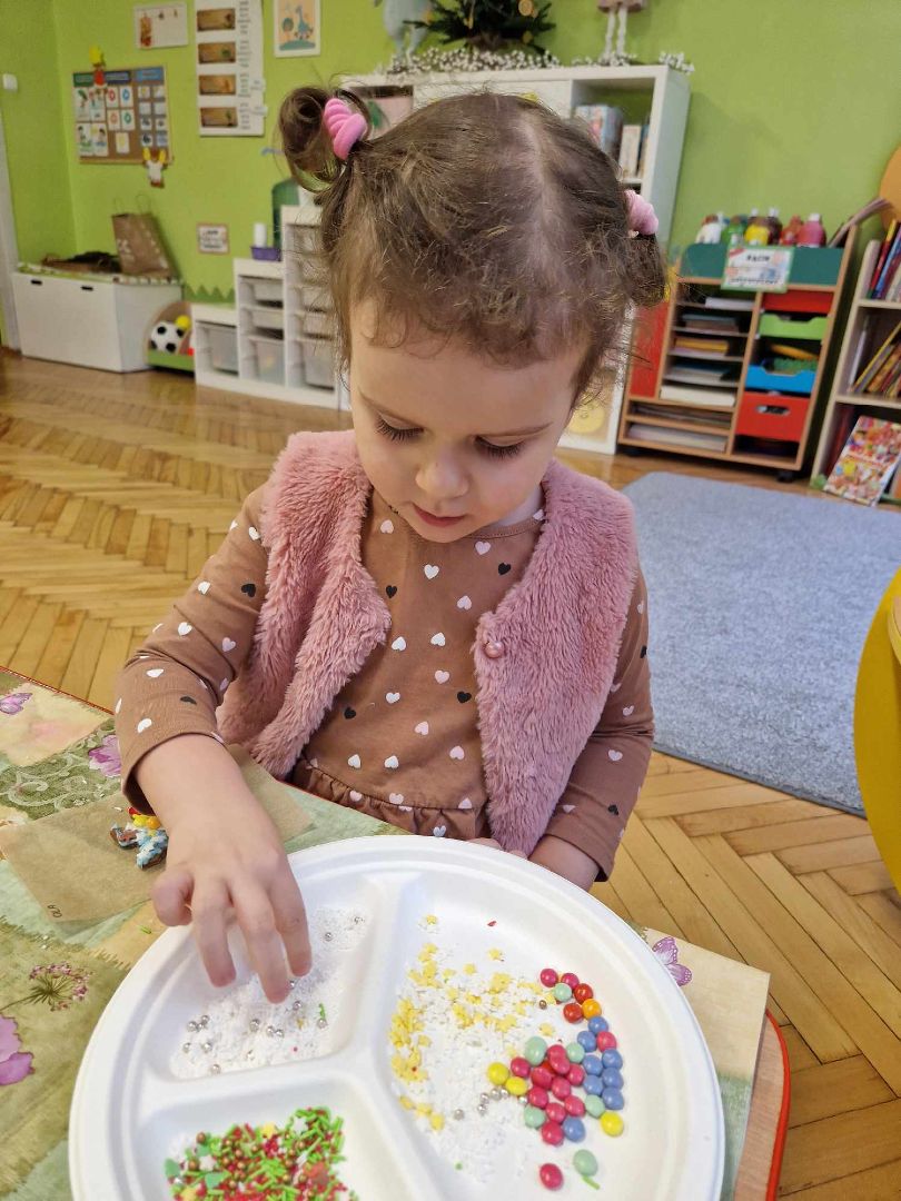 Dziś, przedszkolaki zajęły się dekorowaniem upieczonych dzień wcześniej świątecznych pierniczków. Na stołach pojawił się kolorowy lukier, posypki dekoracyjne oraz pisaki cukrowe, które pomogły dzieciom w samodzielnym dekorowaniu pierniczków. Wszystkie dzieci z wielki zaangażowaniem ozdabiały ciastka lukrami oraz różnymi posypkami. Każdy z świątecznych pierniczków wyglądał inaczej, był wyjątkowy i niepowtarzalny.