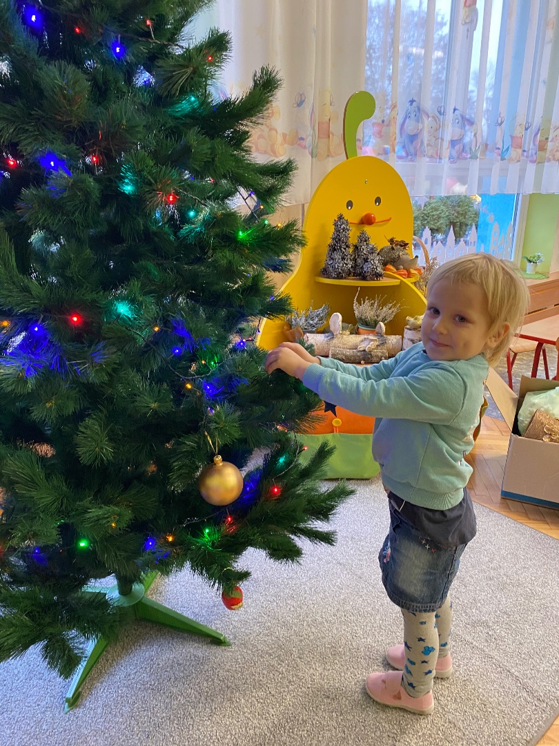 Dzieci z dużym zaangażowaniem pomagały stroić choinkę. W międzyczasie, dowiedziały się w jakiej kolejności zakładamy ozdoby na drzewko. Choinka w sali wprowadziła nas w miłą, świąteczną atmosferę.