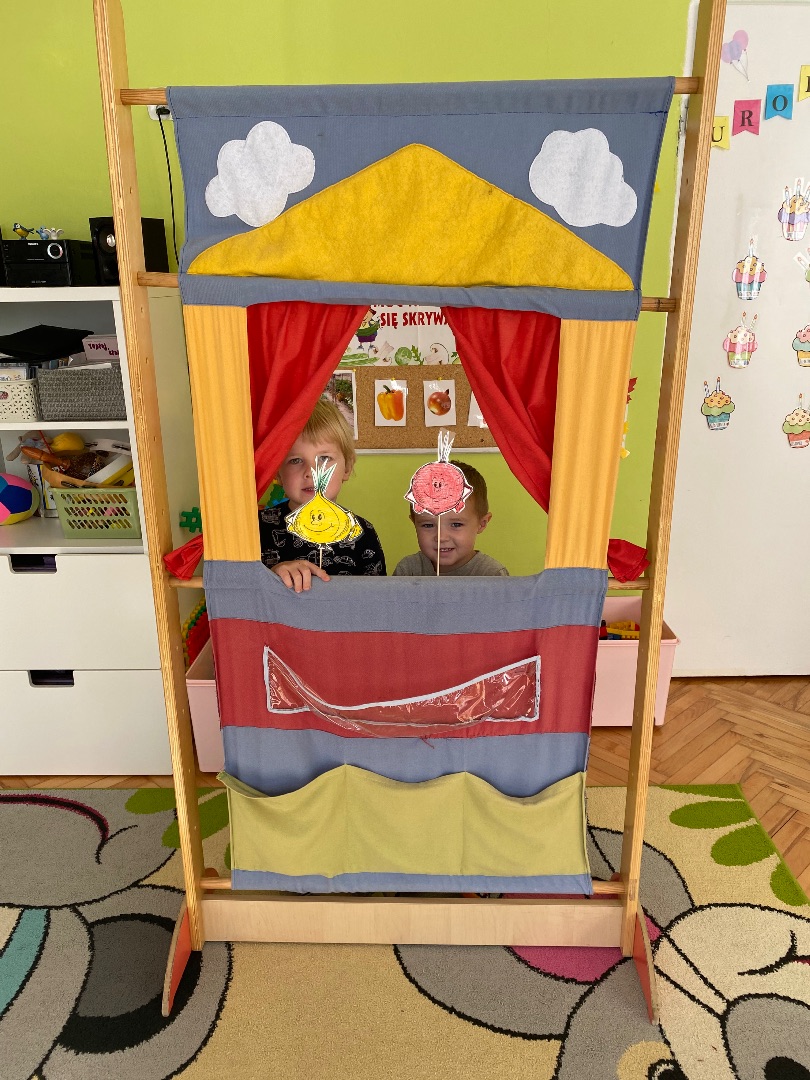 Od 19 do 23 października w naszej grupie rozmawialiśmy o warzywach. W poniedziałek dzieci obejrzały teatrzyk kukiełkowy pt. „Na straganie” Jana Brzechwy. Uczyły się rozpoznawać i nazywać warzywa, określały ich kolor i kształt. Dzieci również próbowały poznać warzywa po dotyku oraz zapachu. Mamy nadzieję, że większość przedszkolaków częściej sięgnie teraz po zdrowe przekąski ;)
