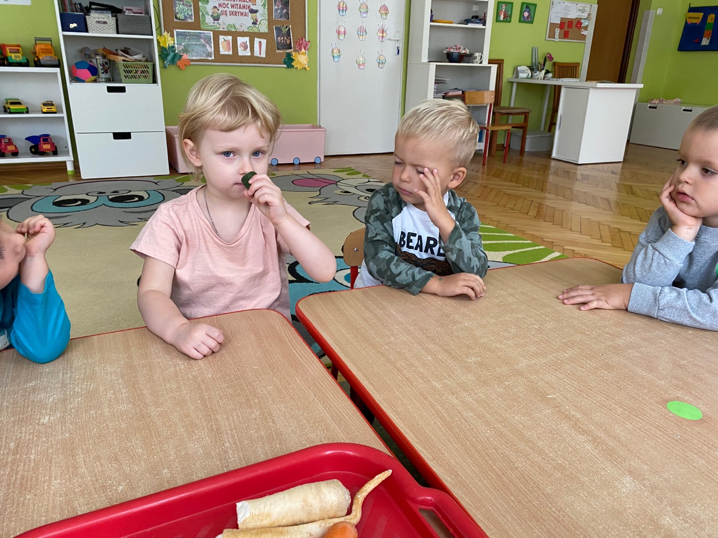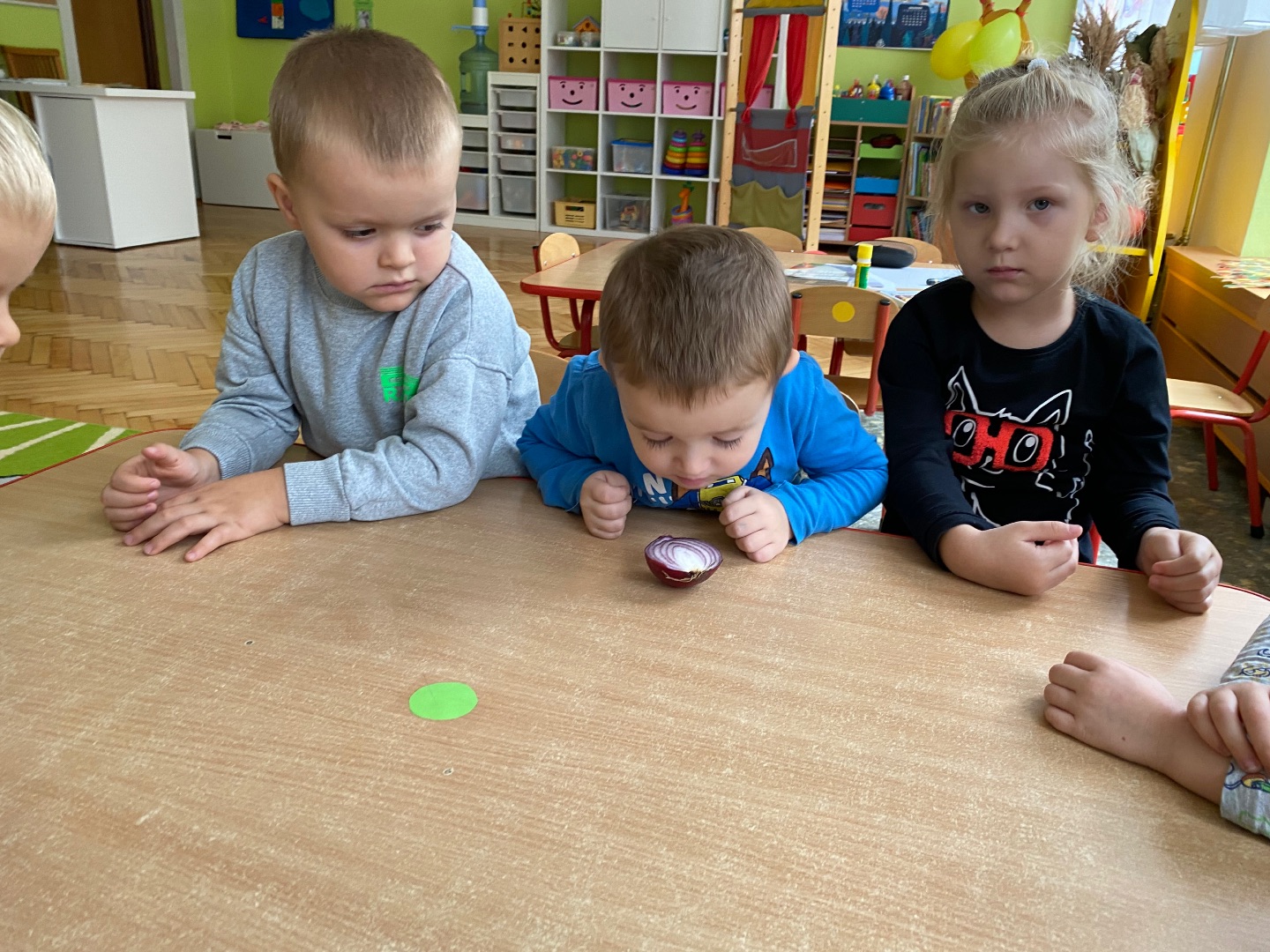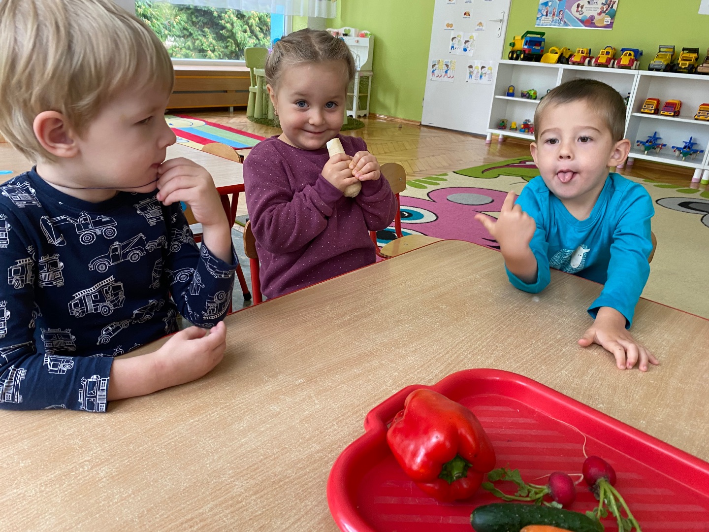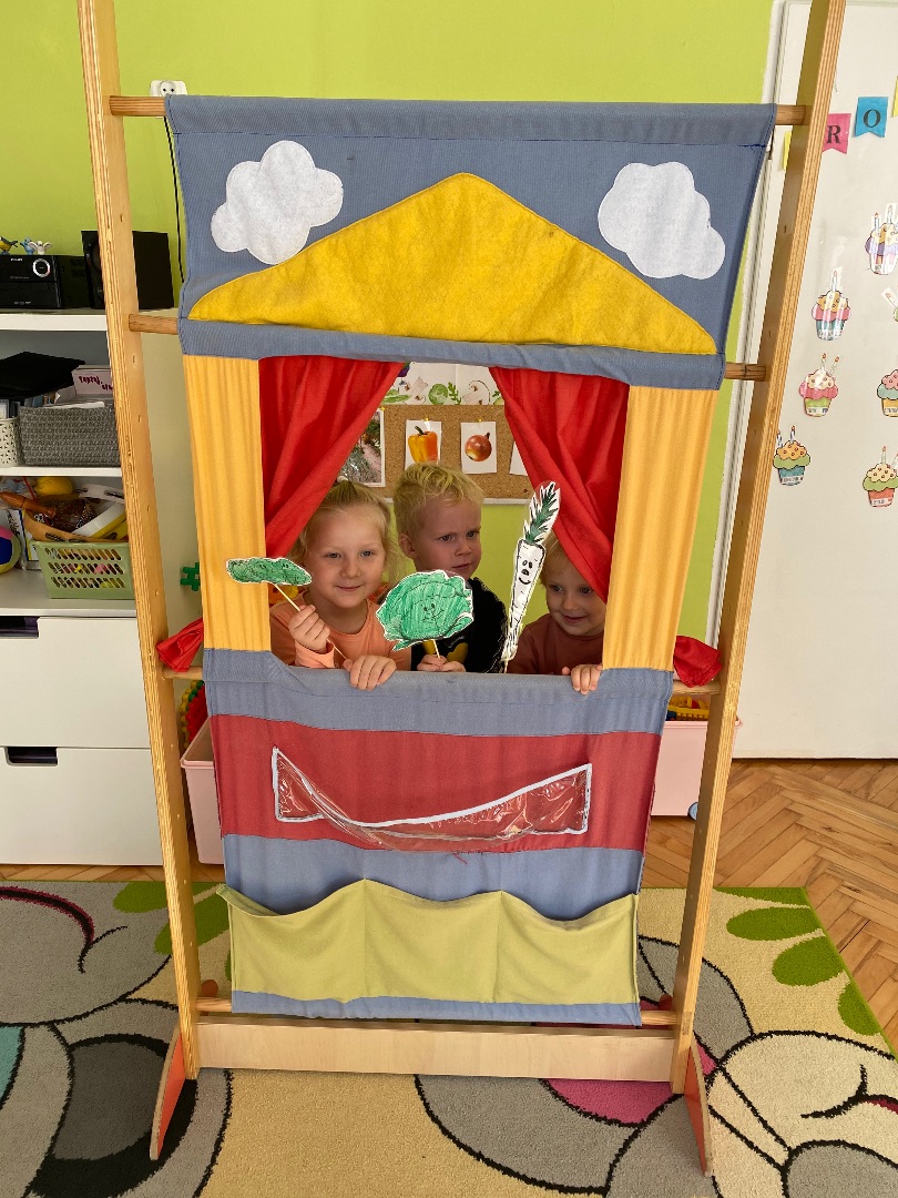 Od 19 do 23 października w naszej grupie rozmawialiśmy o warzywach. W poniedziałek dzieci obejrzały teatrzyk kukiełkowy pt. "Na straganie" Jana Brzechwy. Uczyły się rozpoznawać i nazywać warzywa, określały ich kolor i kształt. Dzieci również próbowały poznać warzywa po dotyku oraz zapachu. Mamy nadzieję, że większość przedszkolaków częściej sięgnie teraz po zdrowe przekąski ;)
