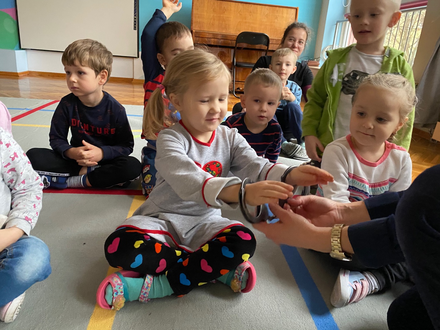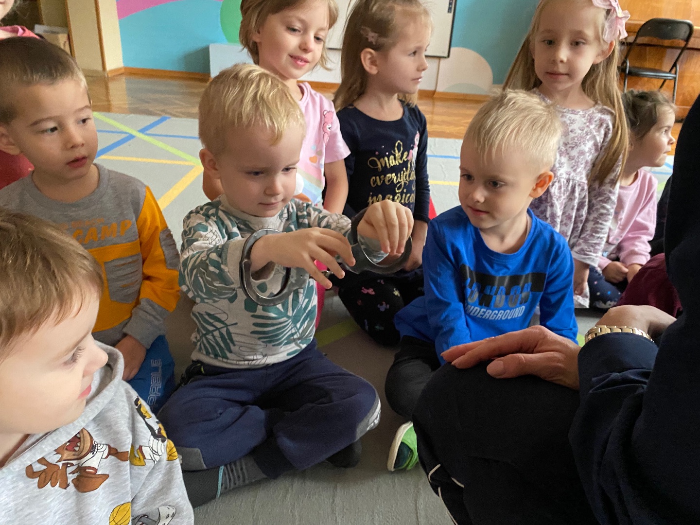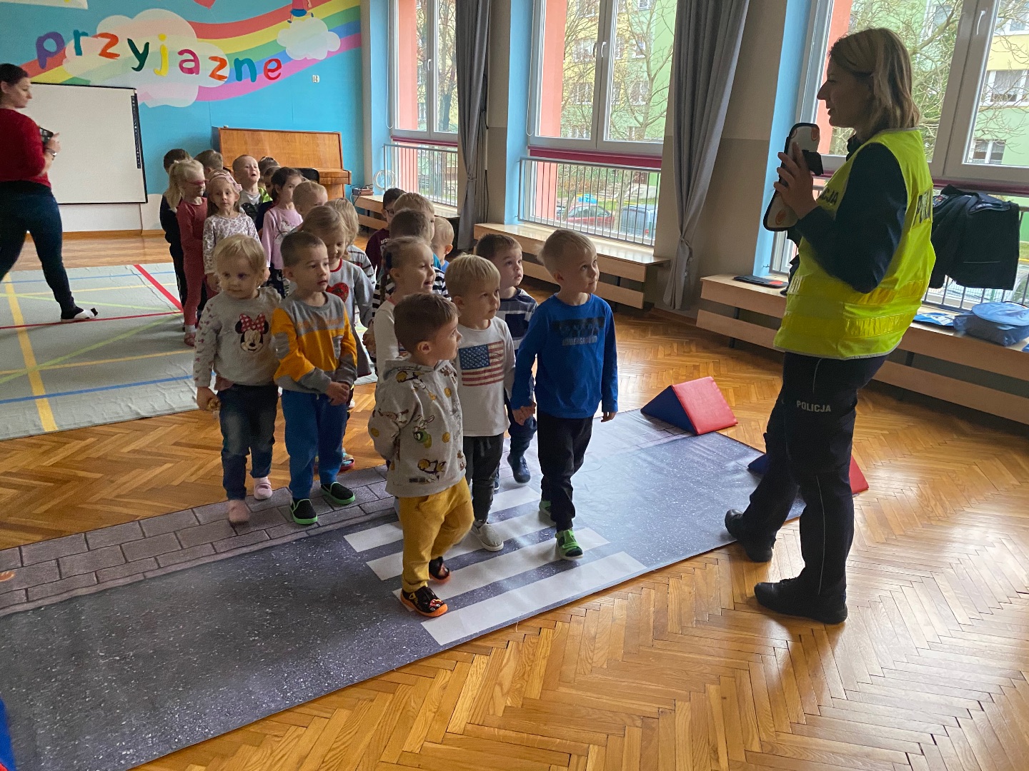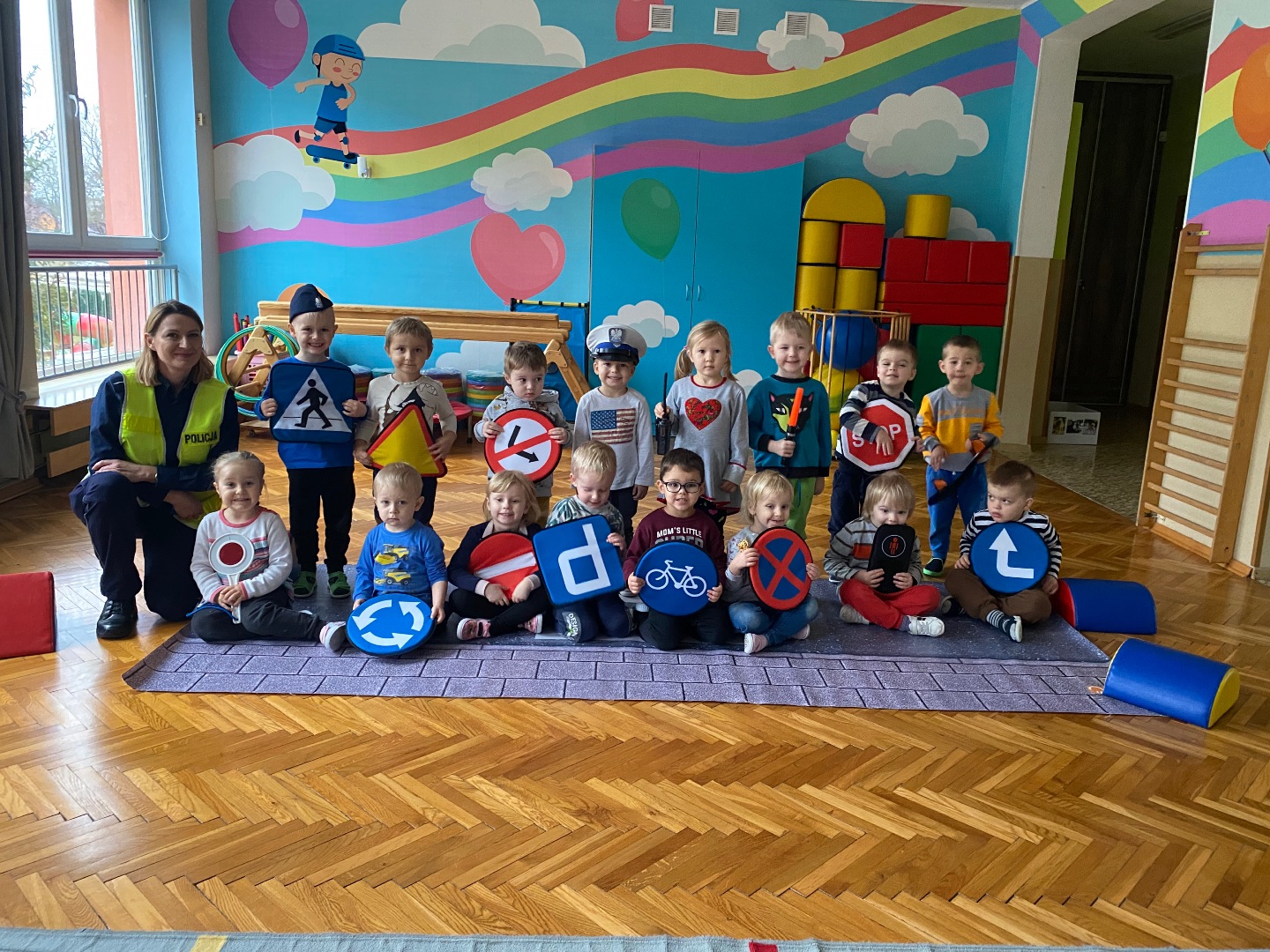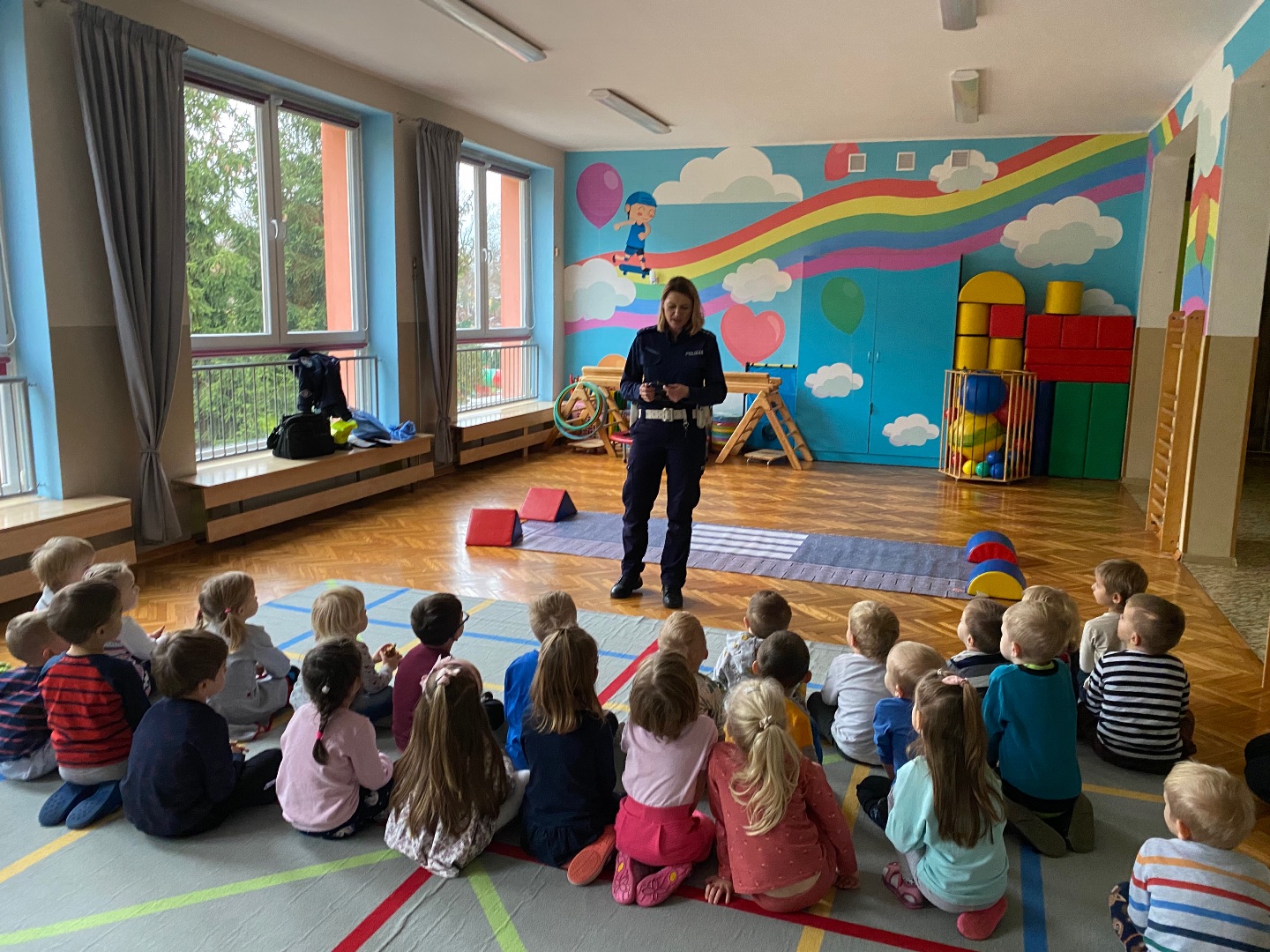 W ramach tygodniowego tematu o bezpieczeństwie odwiedziła nas Pani Policjantka. Rozmawialiśmy na temat konieczności przestrzegania przepisów ruchu drogowego i bezpiecznego przechodzenia przez drogę. Funkcjonariuszka pokazał nam swoje wyposażenie i umundurowanie, które jest niezbędne podczas wykonywania służby. Na koniec wszystkie przedszkolaki otrzymały pamiątkowe kolorowanki.