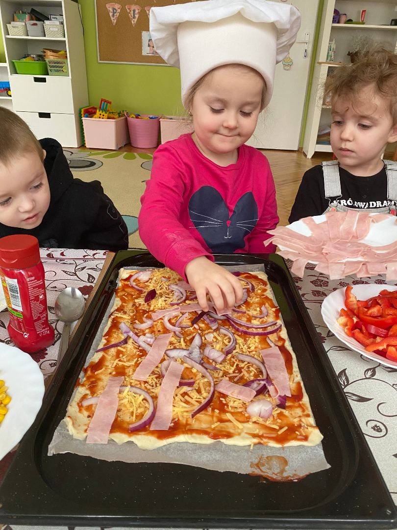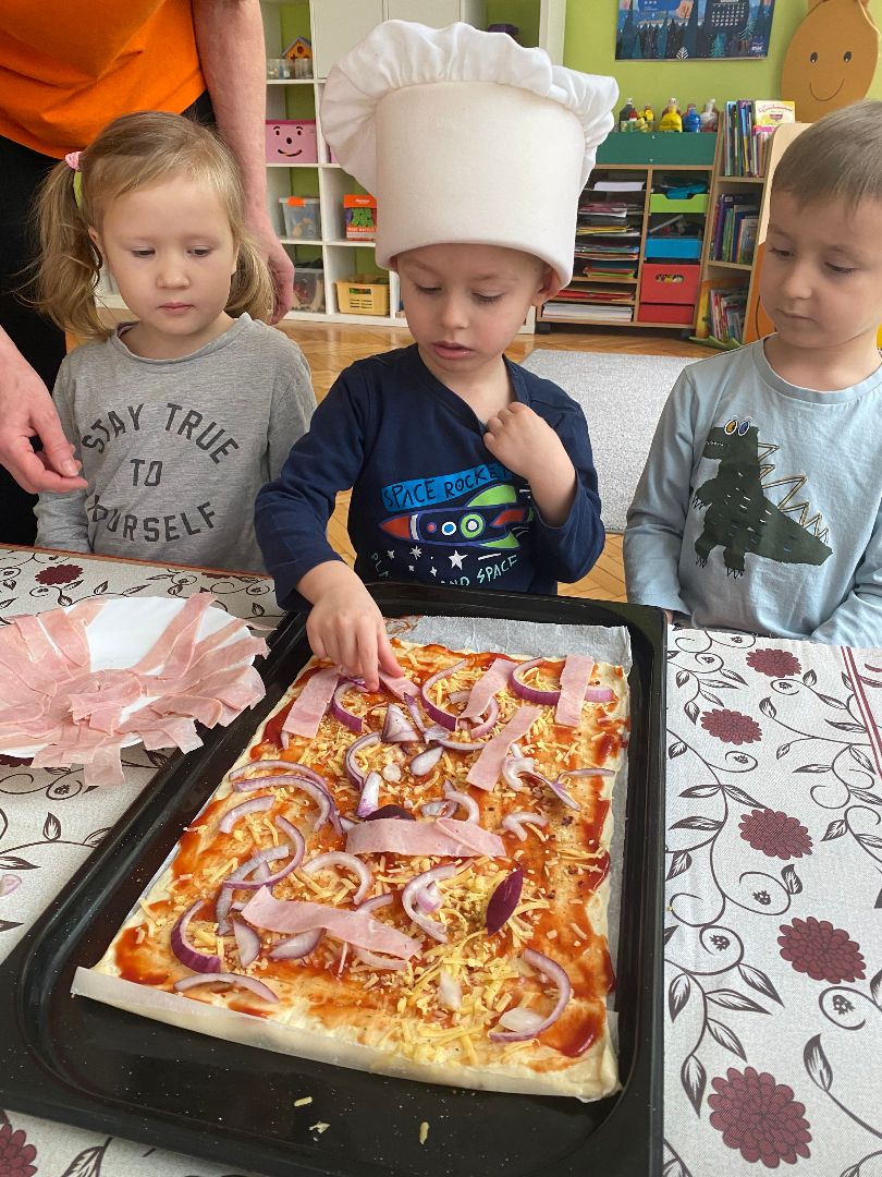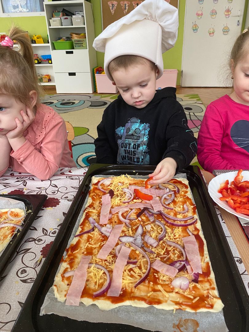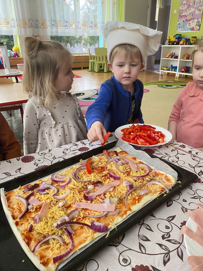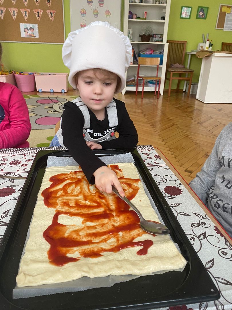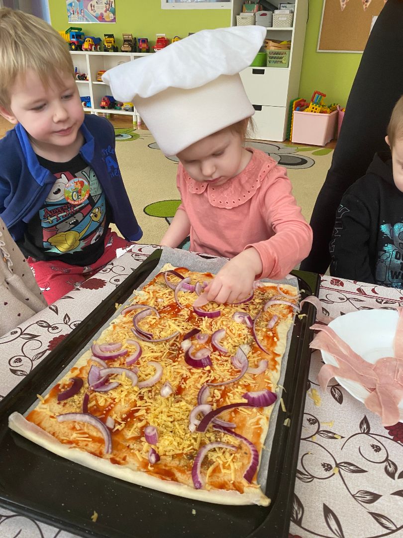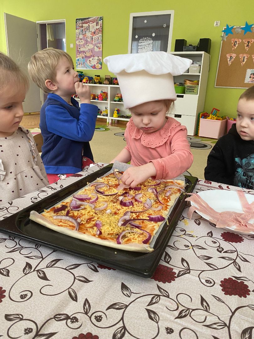 9 lutego obchodziliśmy Międzynarodowy Dzień Pizzy. Tego dnia nasza sala zamieniła się we włoską pizzerię. Przedszkolaki bawiąc się we włoskich kucharzy przygotowały prawdziwą pizzę. Wielką frajdę dzieciom sprawiły już same przygotowania: smarowanie sosem pomidorowym, nakładanie ulubionych składników i posypywanie serem. Gdy wszystko było już gotowe, pizza powędrowała do kuchni, aby się upiec. W trakcie czekania na pizze, wykonaliśmy prace plastyczną. Następnie dzieci z wielkim apetytem próbowały własnoręcznie przygotowanej pizzy. Wspólnie stwierdziliśmy, że własnoręcznie zrobiona pizza jest o wiele zdrowsza i smaczniejsza.