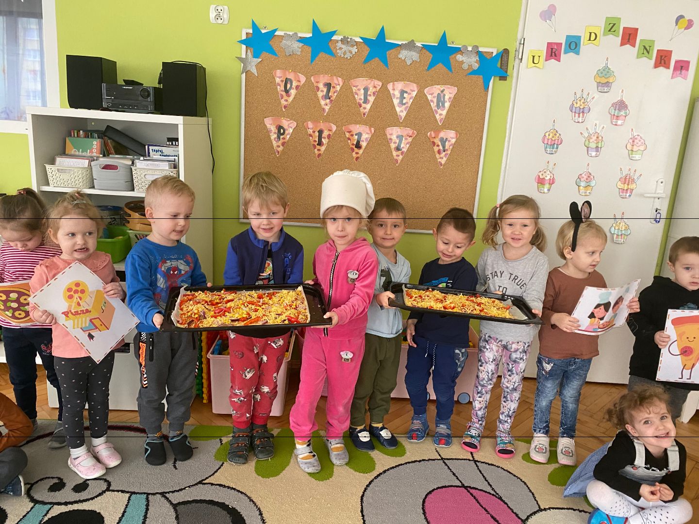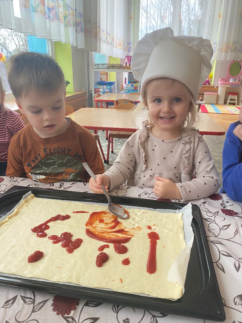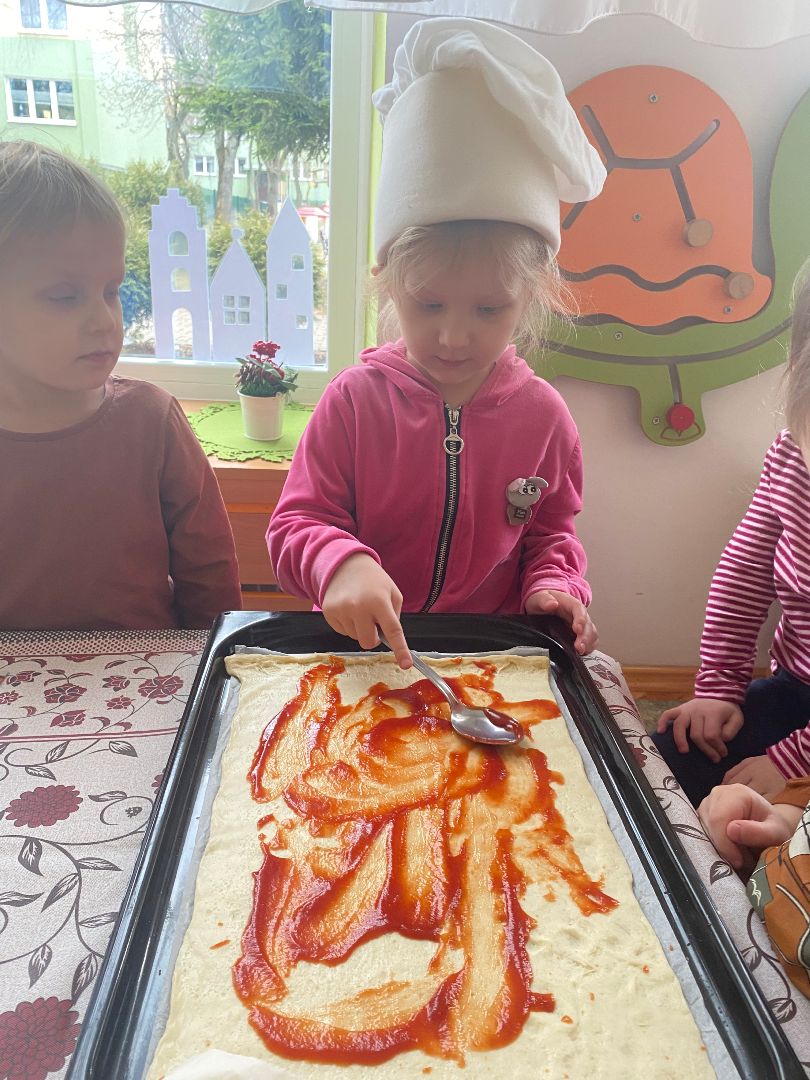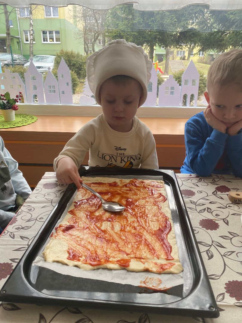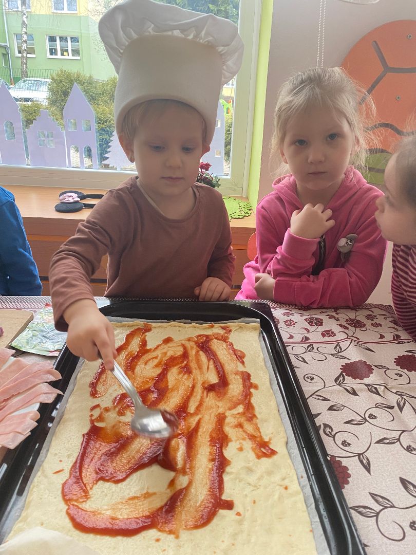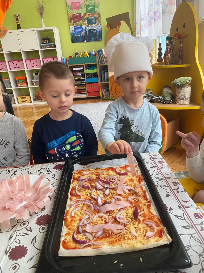 9 lutego obchodziliśmy Międzynarodowy Dzień Pizzy. Tego dnia nasza sala zamieniła się we włoską pizzerię. Przedszkolaki bawiąc się we włoskich kucharzy przygotowały prawdziwą pizzę. Wielką frajdę dzieciom sprawiły już same przygotowania: smarowanie sosem pomidorowym, nakładanie ulubionych składników i posypywanie serem. Gdy wszystko było już gotowe, pizza powędrowała do kuchni, aby się upiec. W trakcie czekania na pizze, wykonaliśmy prace plastyczną. Następnie dzieci z wielkim apetytem próbowały własnoręcznie przygotowanej pizzy. Wspólnie stwierdziliśmy, że własnoręcznie zrobiona pizza jest o wiele zdrowsza i smaczniejsza.