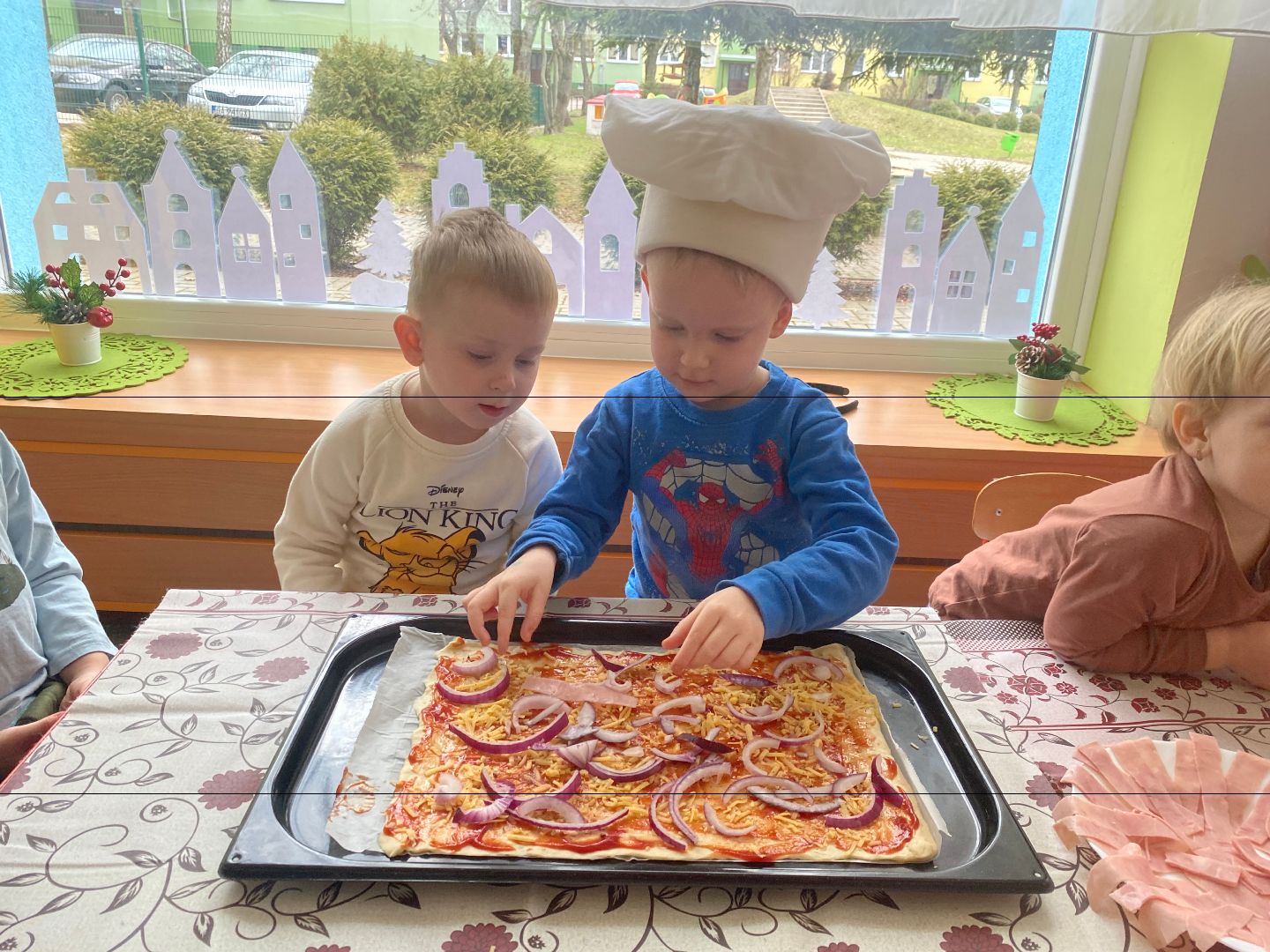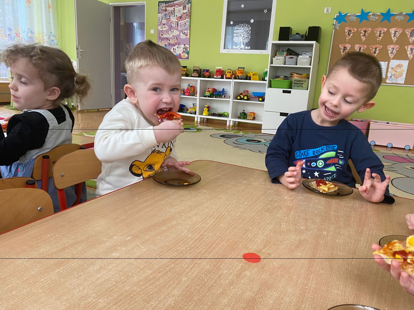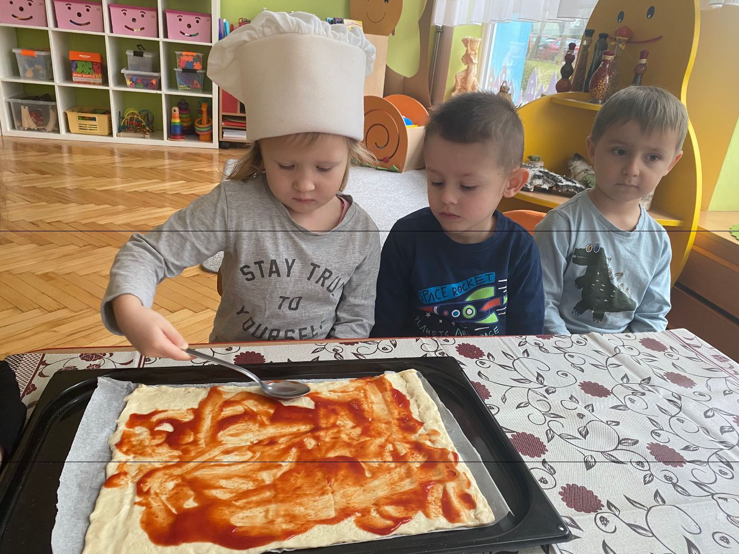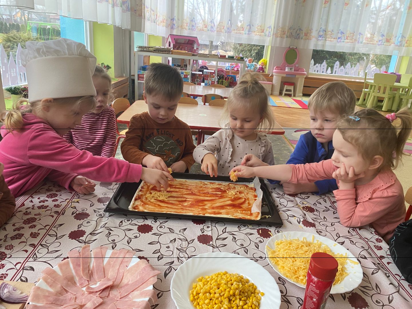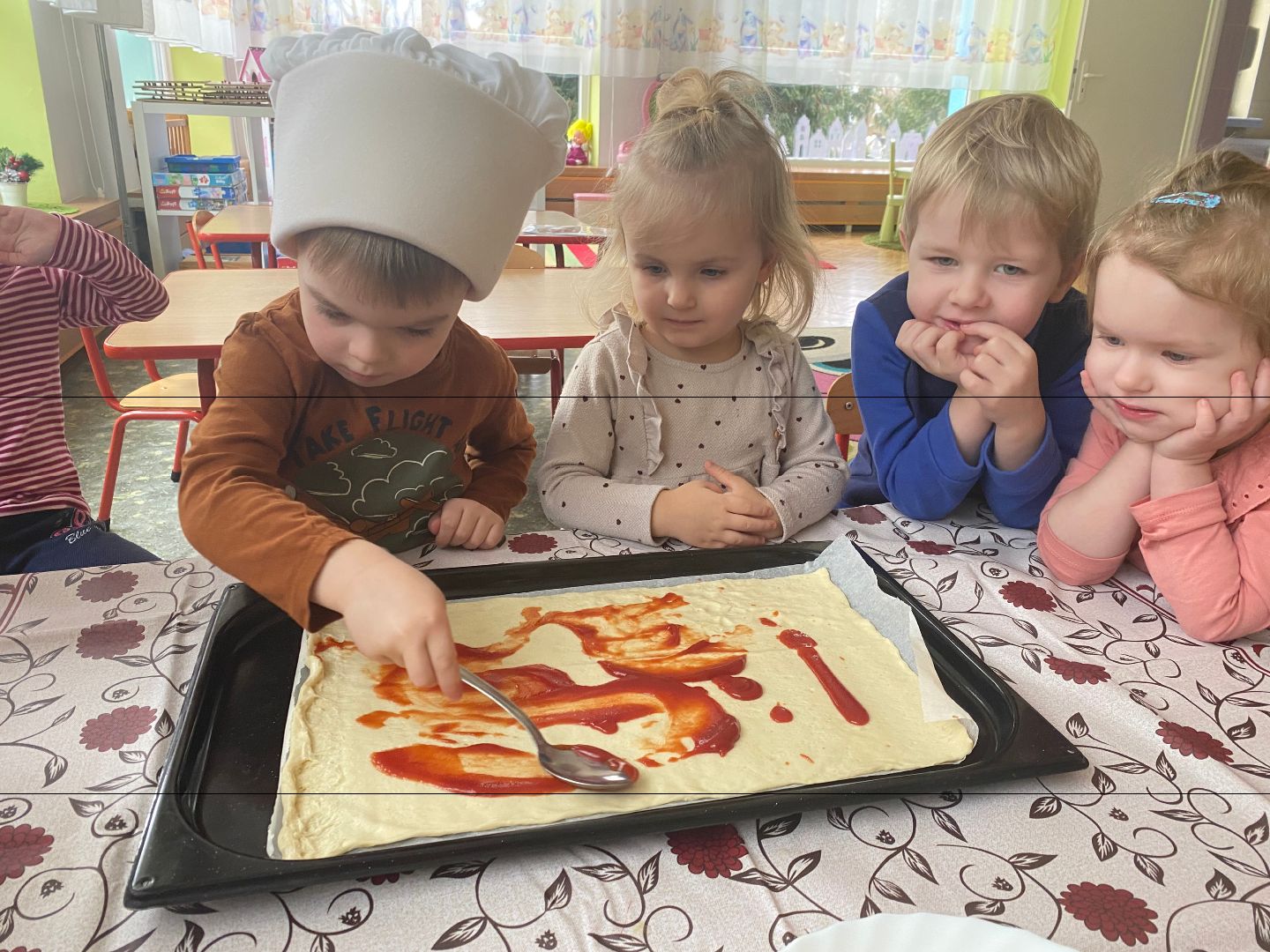 9 lutego obchodziliśmy Międzynarodowy Dzień Pizzy. Tego dnia nasza sala zamieniła się we włoską pizzerię. Przedszkolaki bawiąc się we włoskich kucharzy przygotowały prawdziwą pizzę. Wielką frajdę dzieciom sprawiły już same przygotowania: smarowanie sosem pomidorowym, nakładanie ulubionych składników i posypywanie serem. Gdy wszystko było już gotowe, pizza powędrowała do kuchni, aby się upiec. W trakcie czekania na pizze, wykonaliśmy prace plastyczną. Następnie dzieci z wielkim apetytem próbowały własnoręcznie przygotowanej pizzy. Wspólnie stwierdziliśmy, że własnoręcznie zrobiona pizza jest o wiele zdrowsza i smaczniejsza.