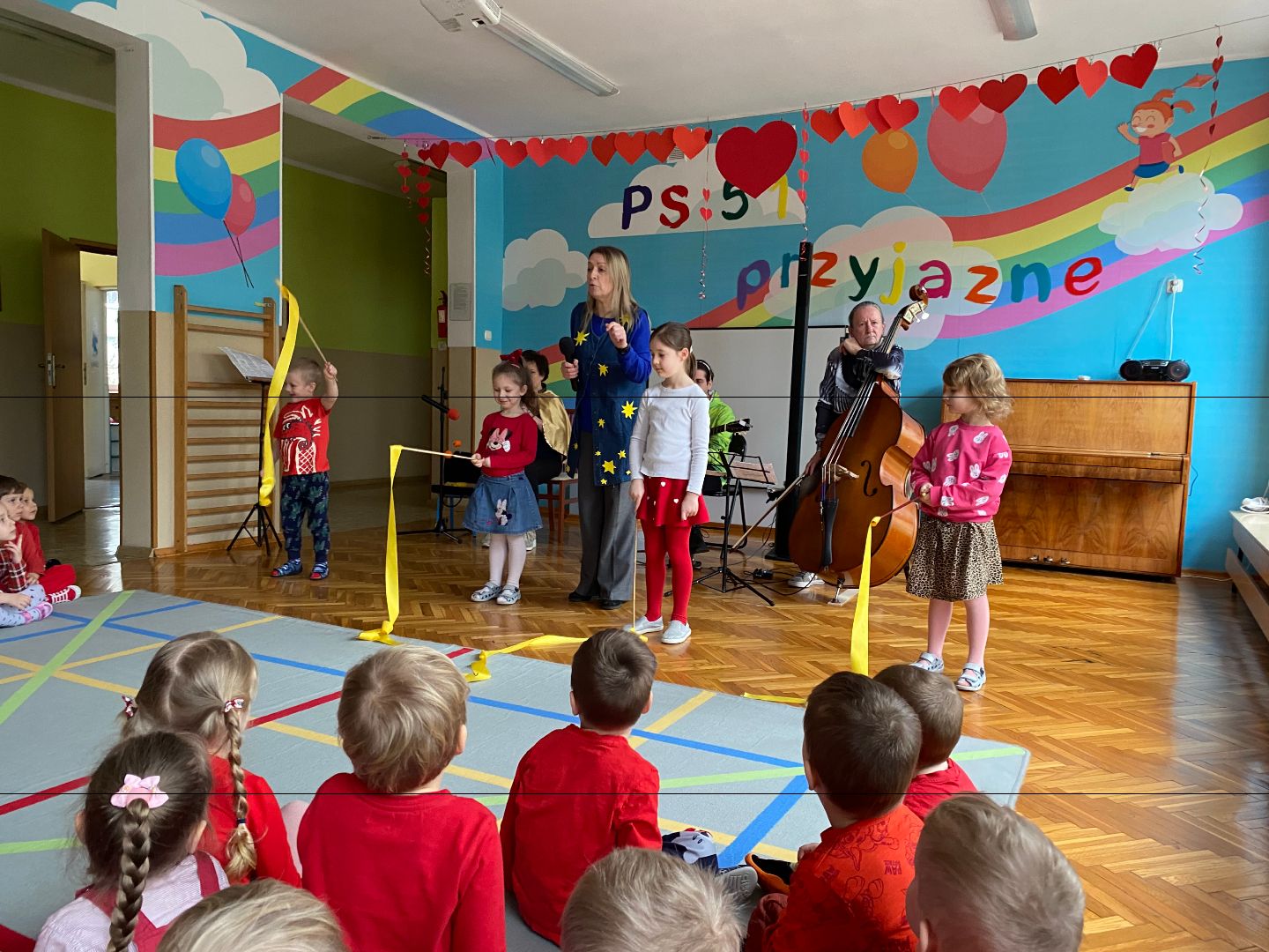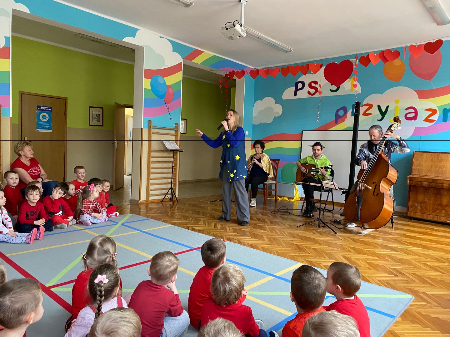 14 lutego obchodziliśmy w naszym przedszkolu Walentynki. W tym dniu wysłuchaliśmy audycji muzycznej w wykonaniu muzyków z Filharmonii Białostockiej. Dzieci słuchały "Kosmicznej muzyki" z różnych planet. Były muzyczne zagadki, a wielu z nas brało udział w muzycznych zabawach. Następnie odbyło się rozstrzygnięcie konkursu "Najpiękniejsza kartka walentynkowa", a na zakończenie wzięliśmy udział w zabawie walentynkowej. Nie zabrakło oczywiście spontanicznych emocji oraz pozytywnych uczuć - co widać na wspólnych zdjęciach dzieci ;) Na koniec tego czerwonego dnia niektóre dzieci otrzymały walentynki i balonika w kształcie serca.