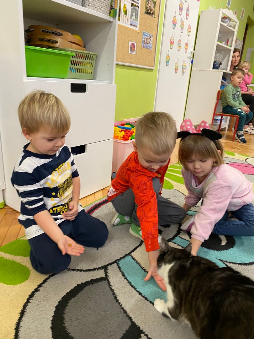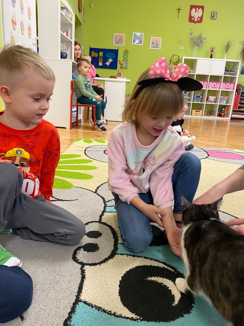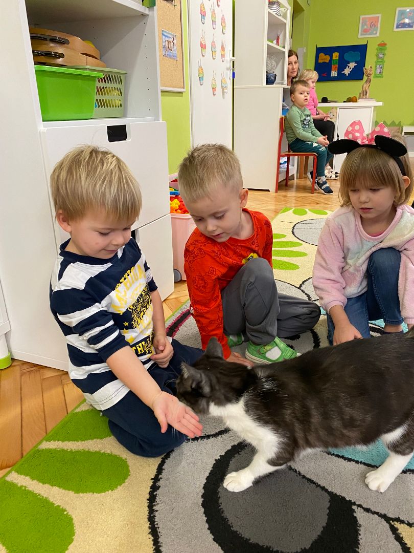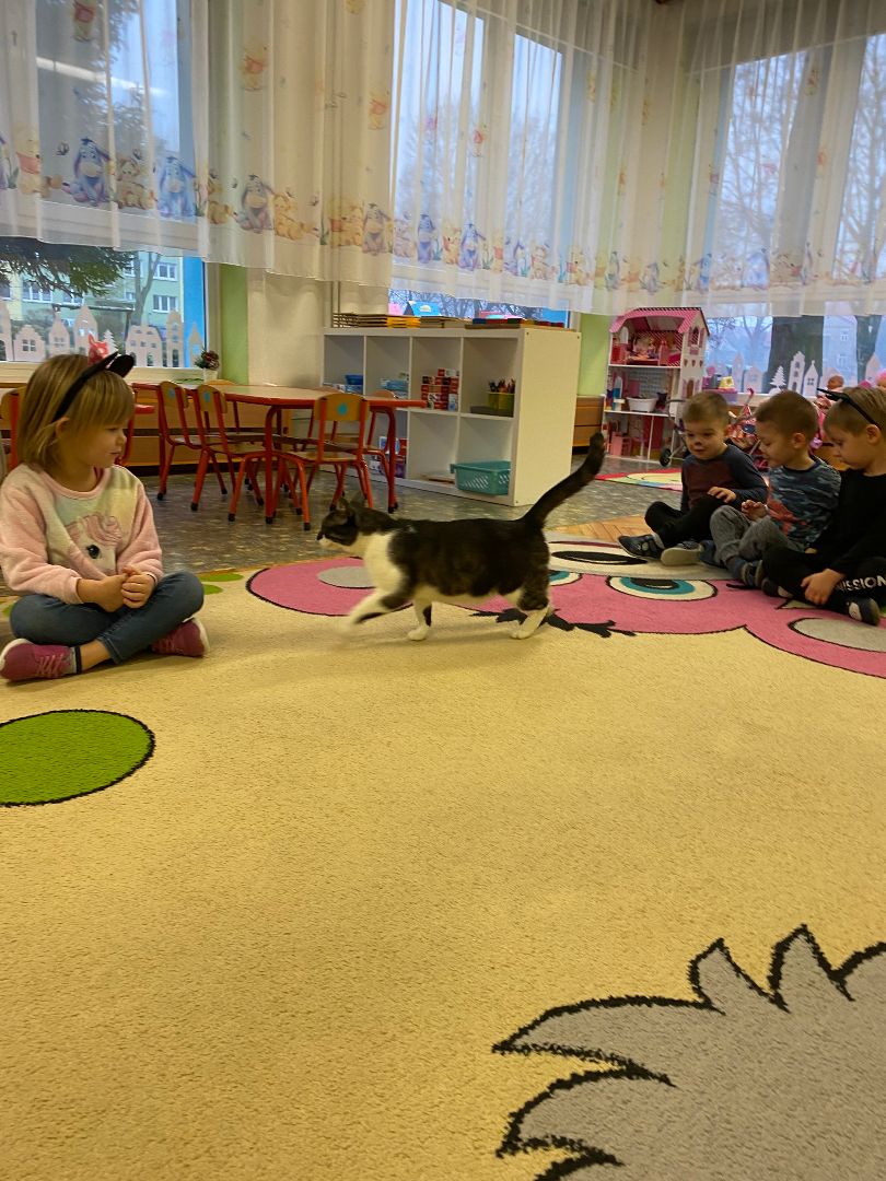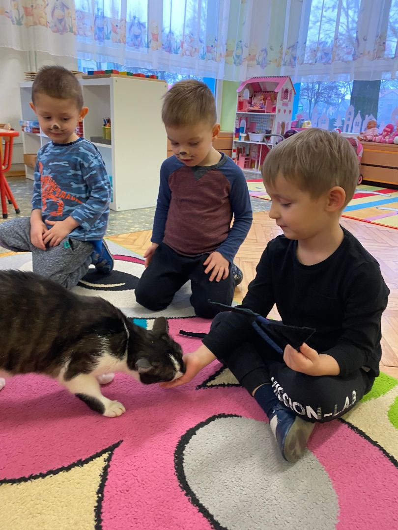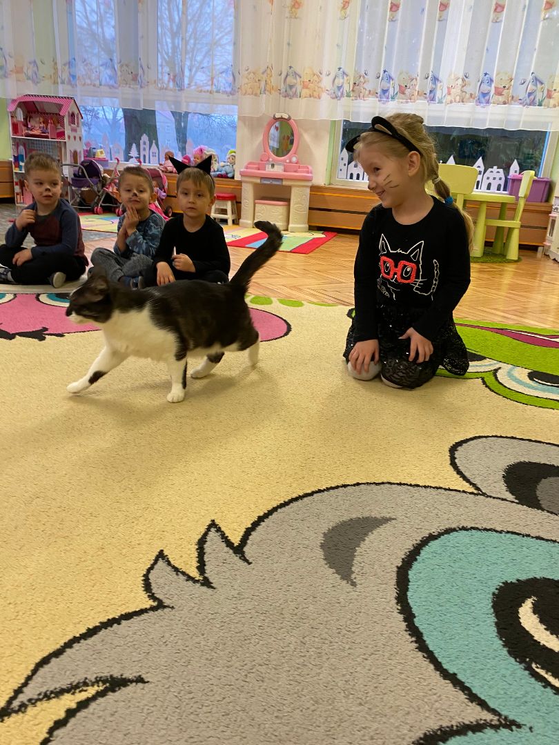 W tym dniu misie upodobniły się do swoich czworonożnych przyjaciół, zakładając przygotowane wcześniej kocie rekwizyty. Były też wesołe „kocie zabawy”, takie jak: kto szybciej wypije mleko, zabawy z włóczką, rozwiązywanie zagadek,śpiewanie kocich piosenek i wykonywanie pracy plastycznej. Największa atrakcją była wizyta kota Gustawa. Był to najprzyjemniejszy moment dla dzieci, ponieważ mogły kotka pogłaskać, podać mu smakołyk. Dziękujemy Mamie Oli za umożliwienie dzieciom spotkania z kotkiem.