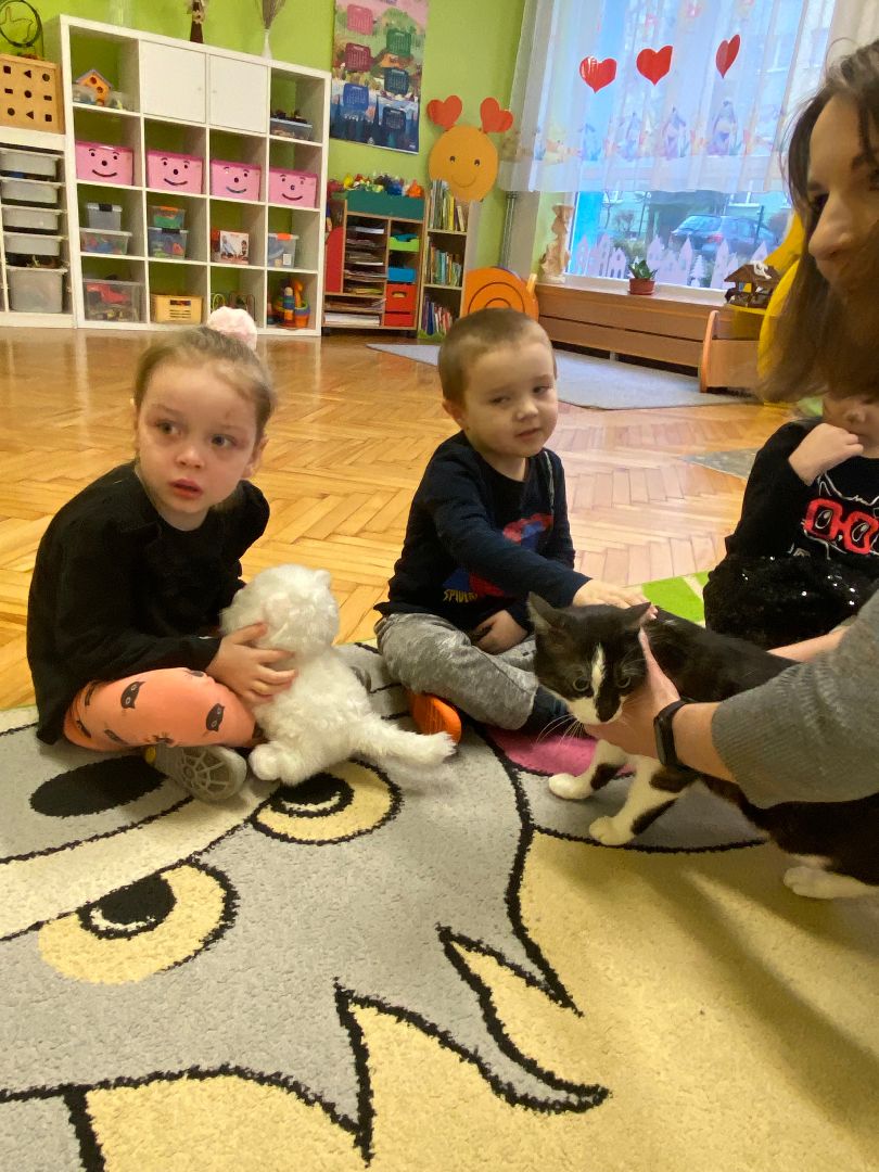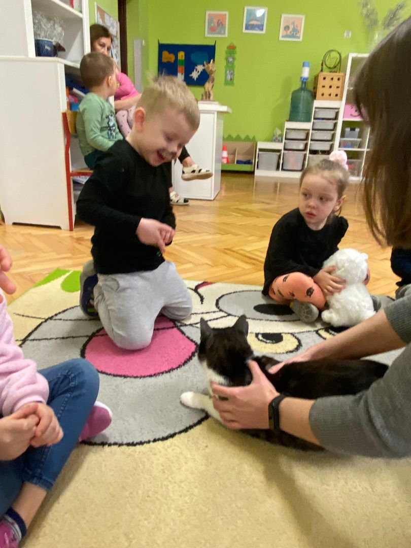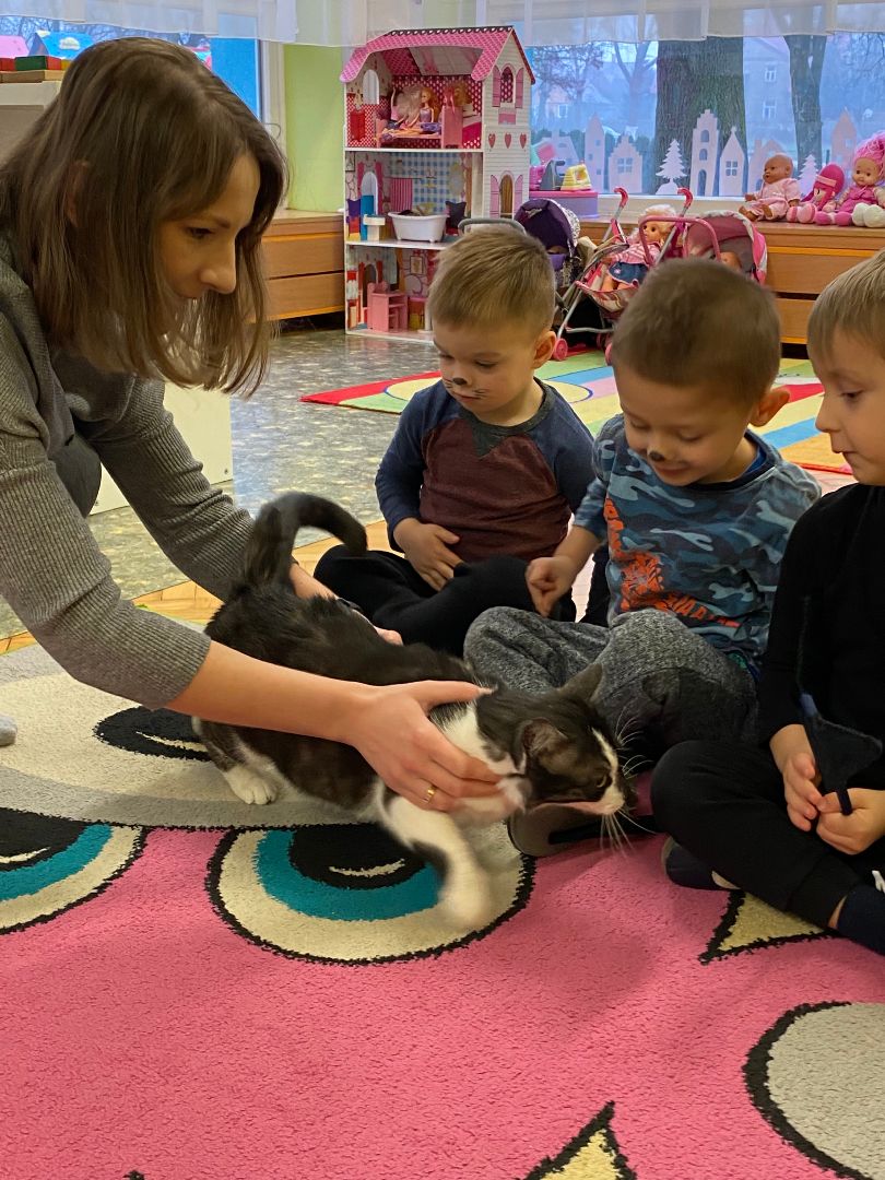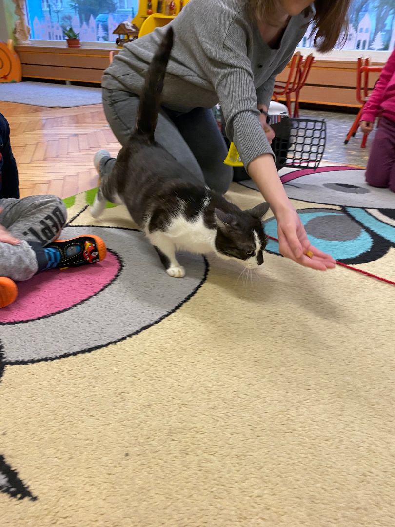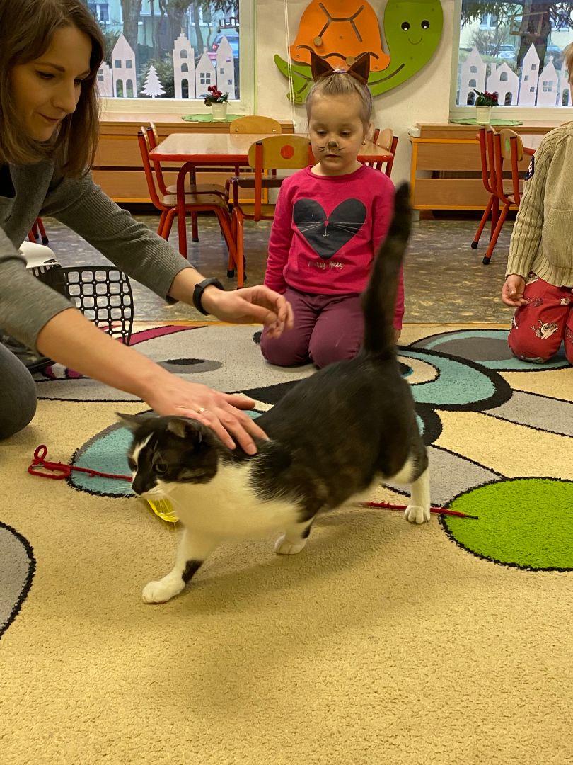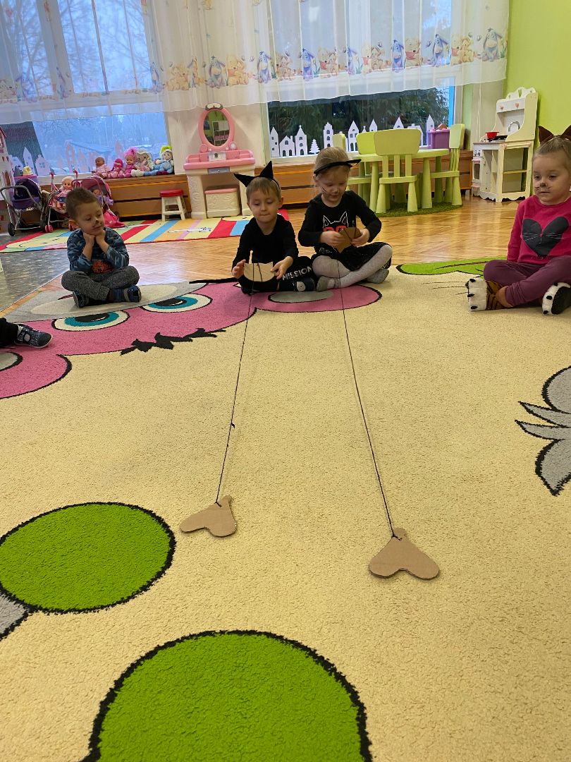 W tym dniu misie upodobniły się do swoich czworonożnych przyjaciół, zakładając przygotowane wcześniej kocie rekwizyty. Były też wesołe „kocie zabawy”, takie jak: kto szybciej wypije mleko, zabawy z włóczką, rozwiązywanie zagadek,śpiewanie kocich piosenek i wykonywanie pracy plastycznej. Największa atrakcją była wizyta kota Gustawa. Był to najprzyjemniejszy moment dla dzieci, ponieważ mogły kotka pogłaskać, podać mu smakołyk. Dziękujemy Mamie Oli za umożliwienie dzieciom spotkania z kotkiem.