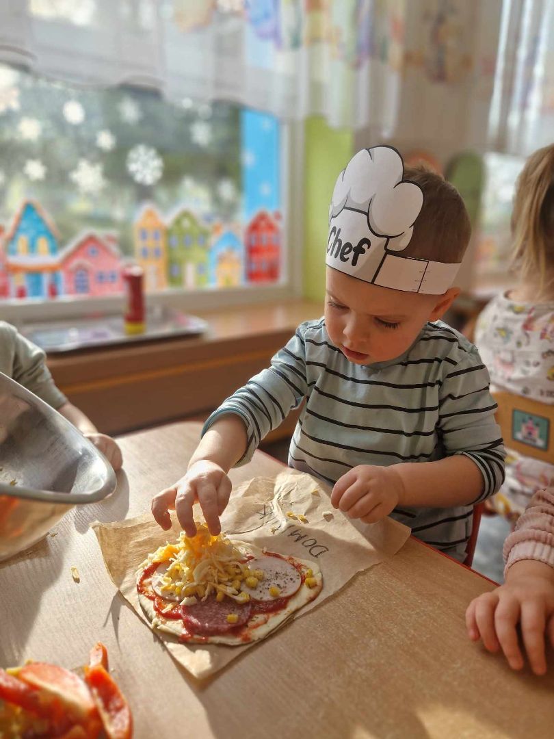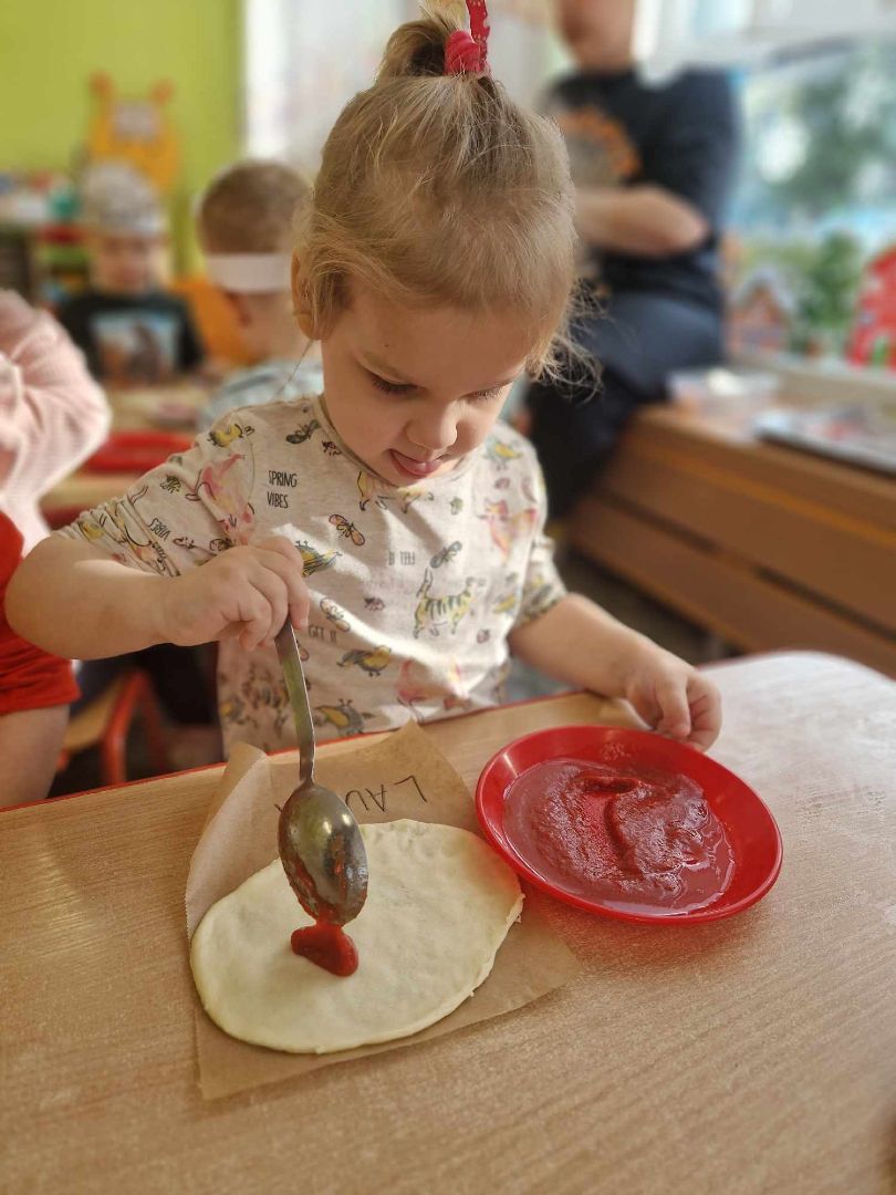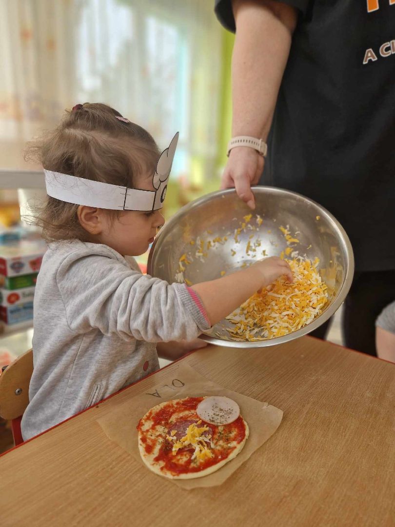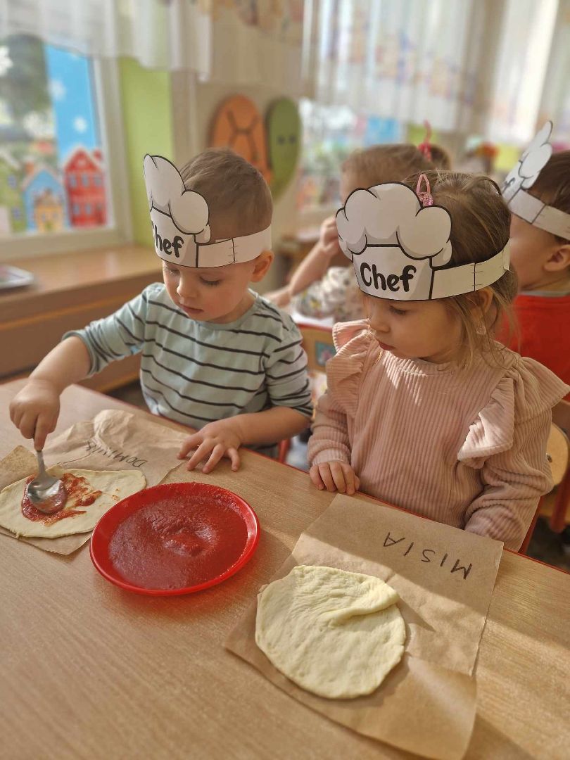 Dnia 9 lutego (piątek) 2024 r. w naszej grupie obchodziliśmy Międzynarodowy Dzień Pizzy. Podczas obchodów tego dnia nietypowego dzieci poznały krótką historię pizzy, dowiedziały się, z którego kraju pochodzi oraz z jakich składników można ją zrobić. Następnie przedszkolaki umyły rączki i z wielkim zaangażowaniem zabrały się do przygotowania pizzy. Na specjalnie przygotowanych stanowiskach dzieci smarowały sosem ciasto, układały wędliny, kukurydzę i posypywały serem. Tak przygotowane pizzę trafiły do przedszkolnej kuchni, zapach z piekarnika rozchodził się po całym przedszkolu, a dzieci nie mogły się doczekać, kiedy będą mogły skosztować samodzielnie przygotowanego dania.