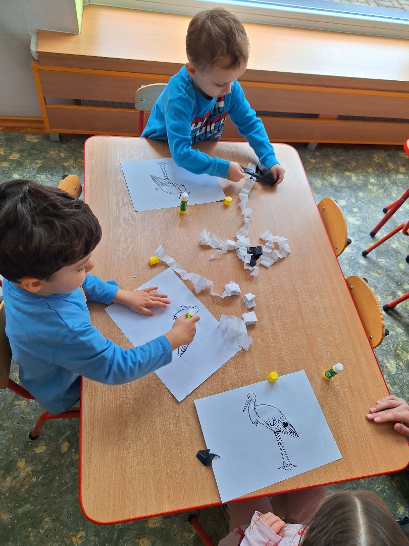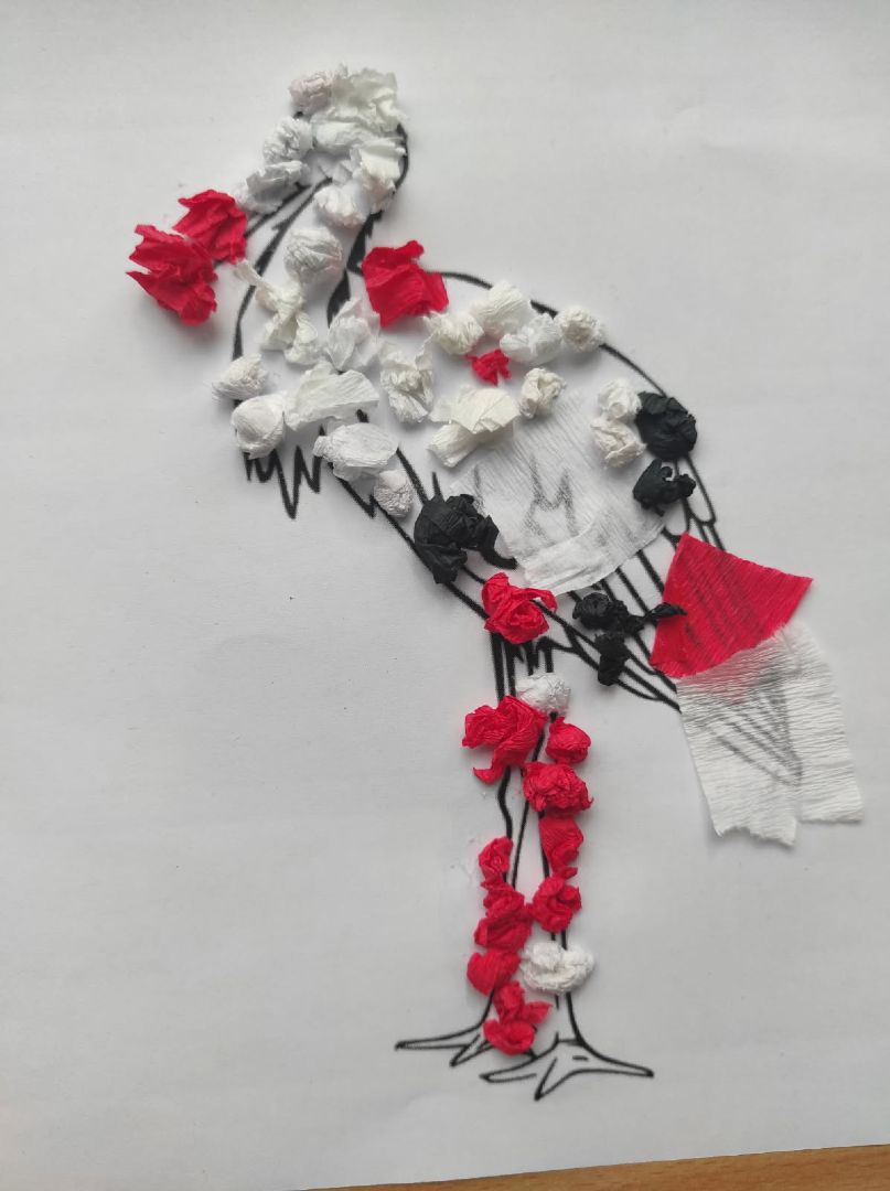 "Bocian"- praca plastyczna- wyklejanie bibułą