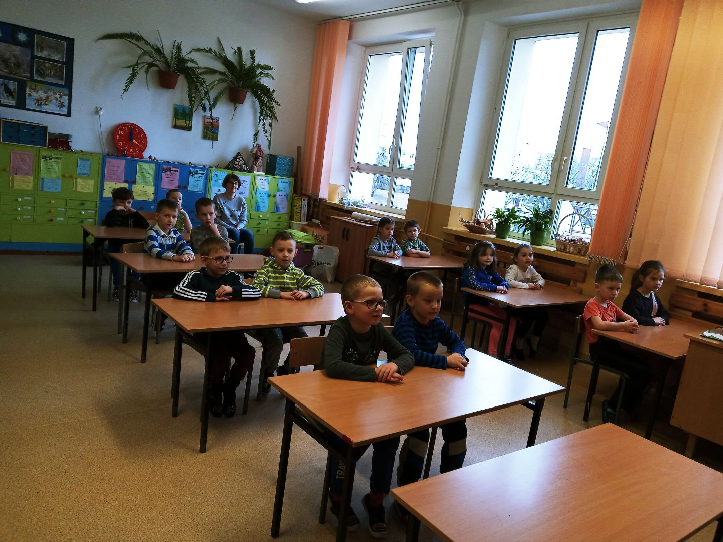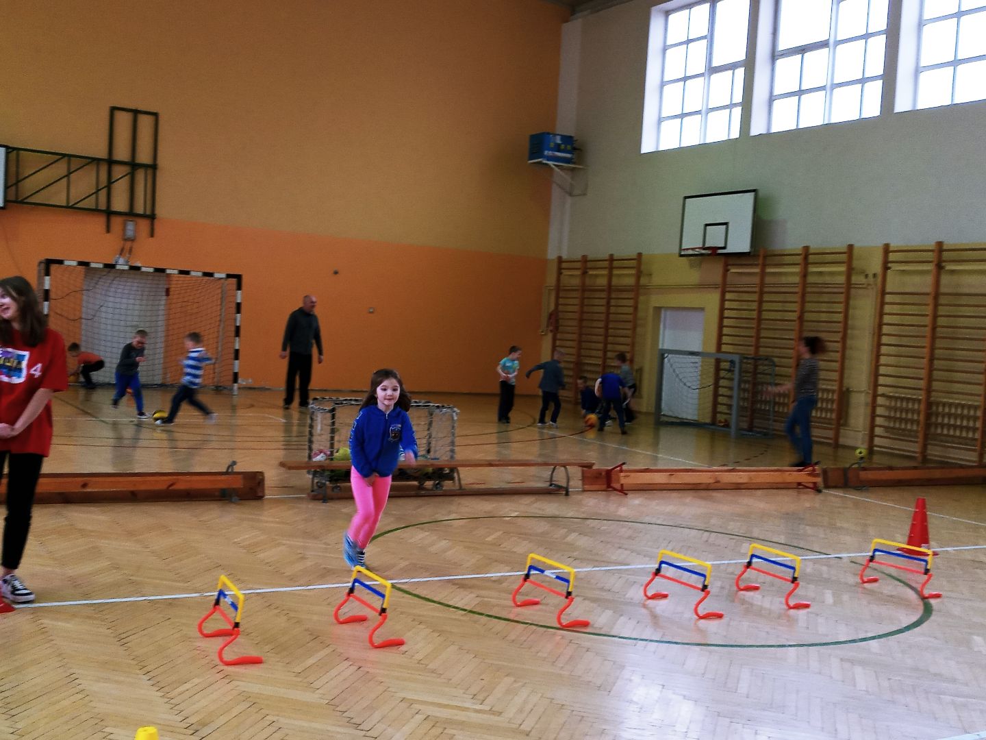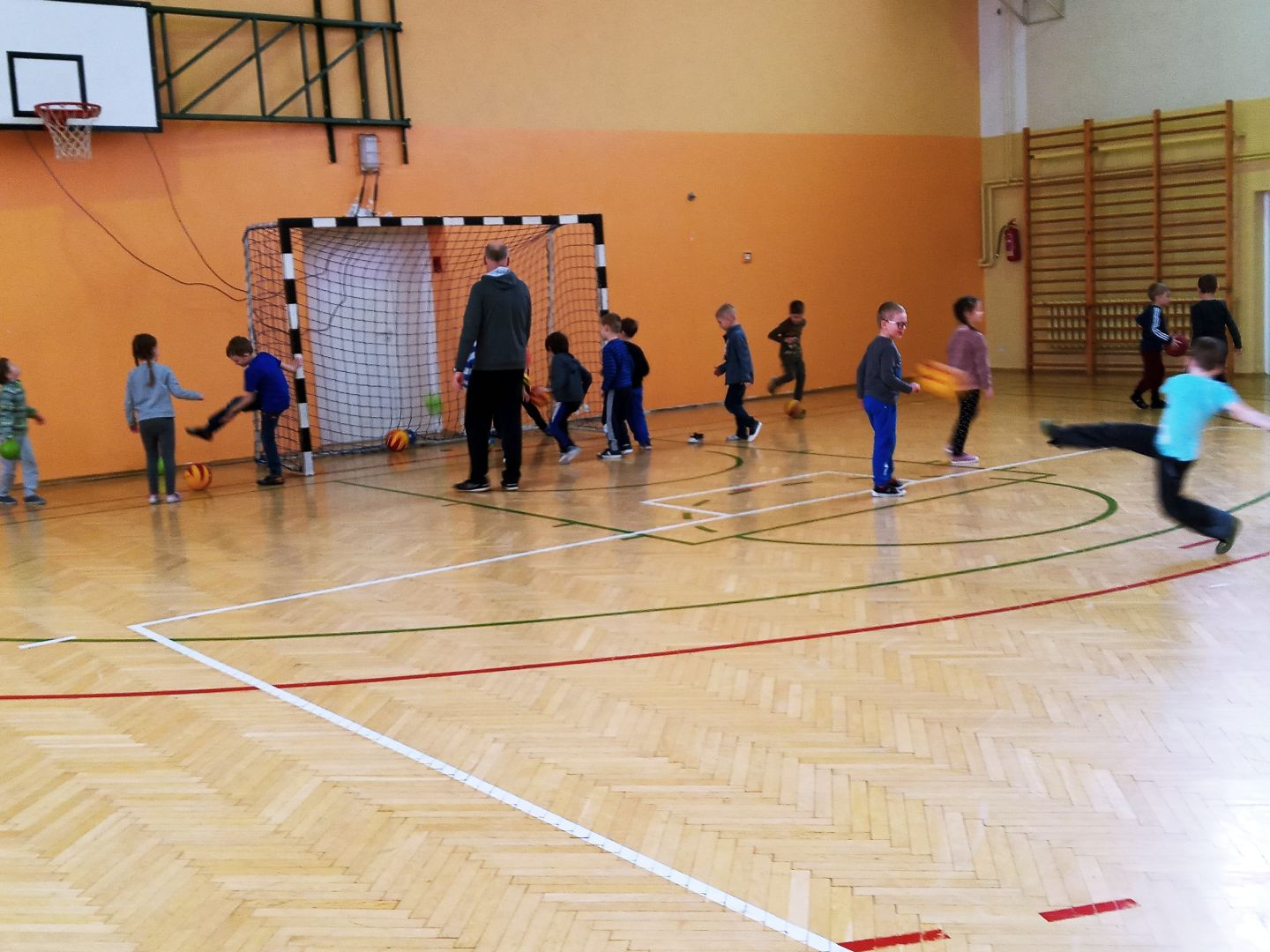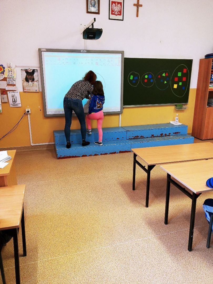 Podczas pobytu w szkole dzieci obejrzały szatnię, klasę lekcyjną, świetlicę. Uczestniczyły w prawdziwej lekcji. Wielką atrakcją były zabawy na sali gimnastycznej.