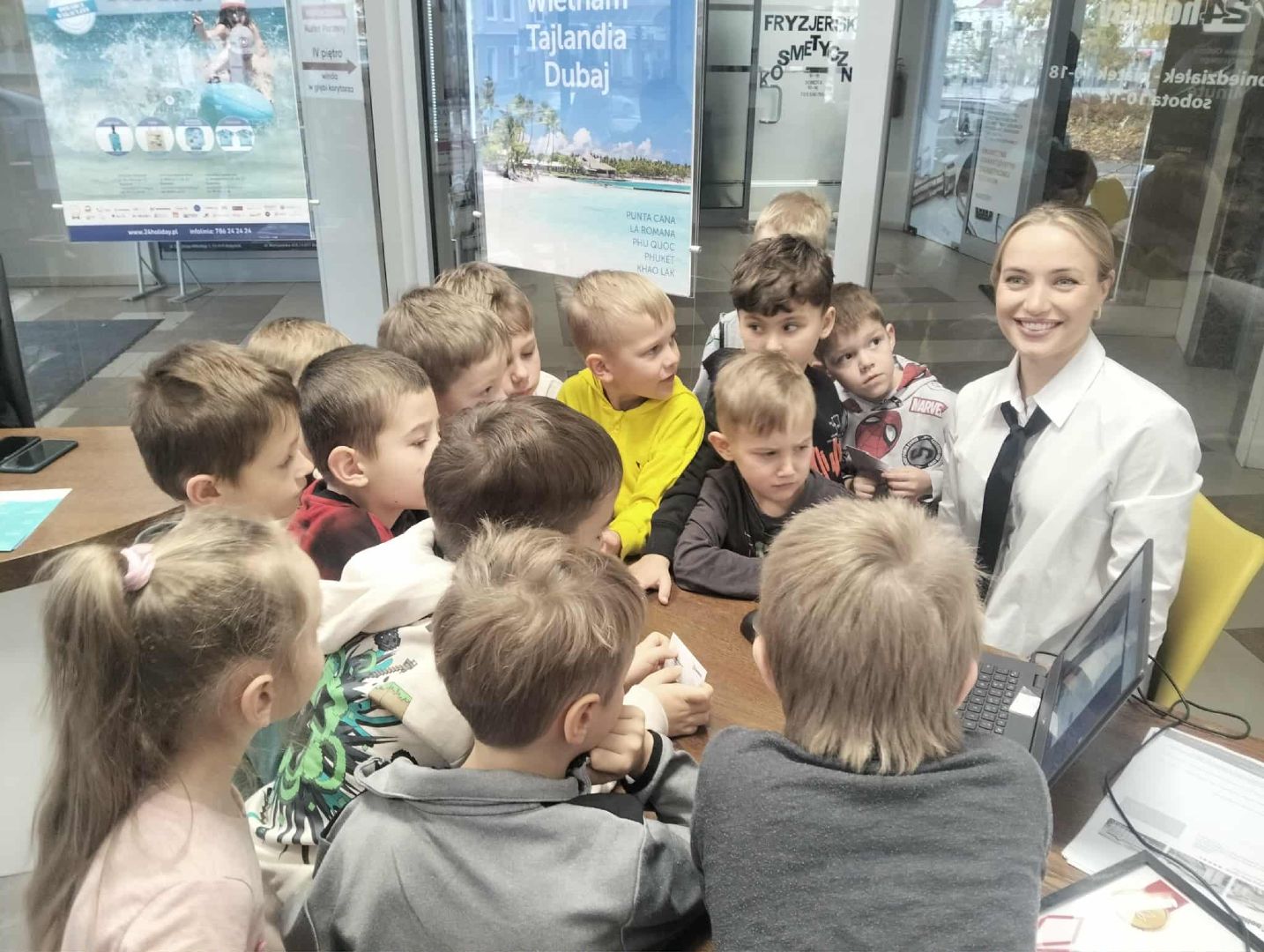 Dzieci miały również okazję zobaczyć, jak wygląda praca w biurze podróży – poznały obowiązki pracowników, dowiedziały się, jak rezerwuje się bilety, planuje trasy wycieczek i przygotowuje oferty dla klientów.