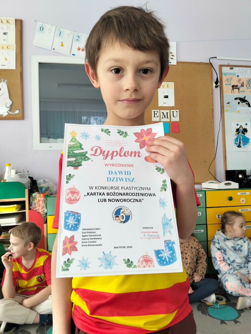Dawid wziął udział w pozaprzedszkolnym konkursie plastycznym pt. „Kartka Bożonarodzeniowa”. Celem konkursu było rozwijanie kreatywności, zdolności manualnych oraz wyobraźni dzieci poprzez tworzenie oryginalnych prac świątecznych.