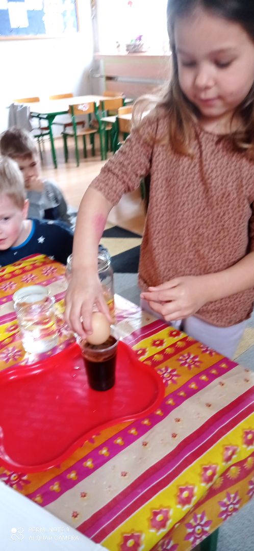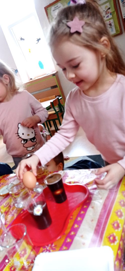 Dzieci z grupy Smerfy na dzisiejszych zajęciach badały z czego składa się jajko od kurki, sprawdzały dlaczego jedno jajko tonie w wodzie a drugie nie, określały ciężar lżejsze/cięższe . Porównywały również wygląd jajka ugotowanego na twardo i surowego .Sprawdziły także jak powstaje osad na naszych zębach za pomocą jajek, kawy i herbaty . Zajęcia okazały się bardzo interesujące i pouczające dla naszych przedszkolaków.