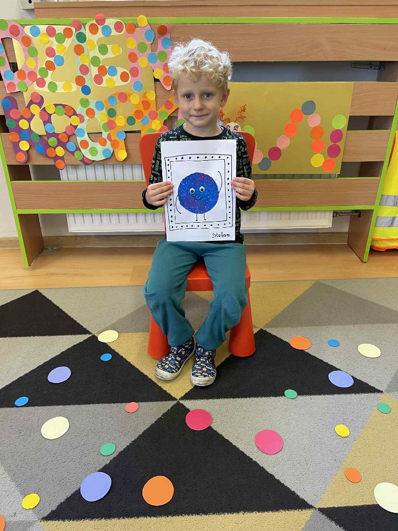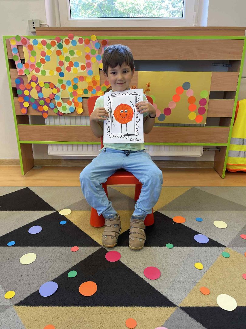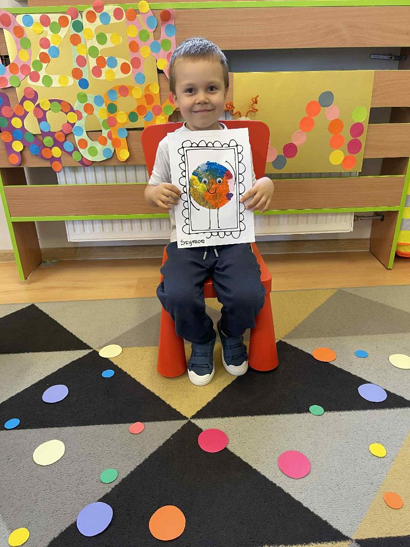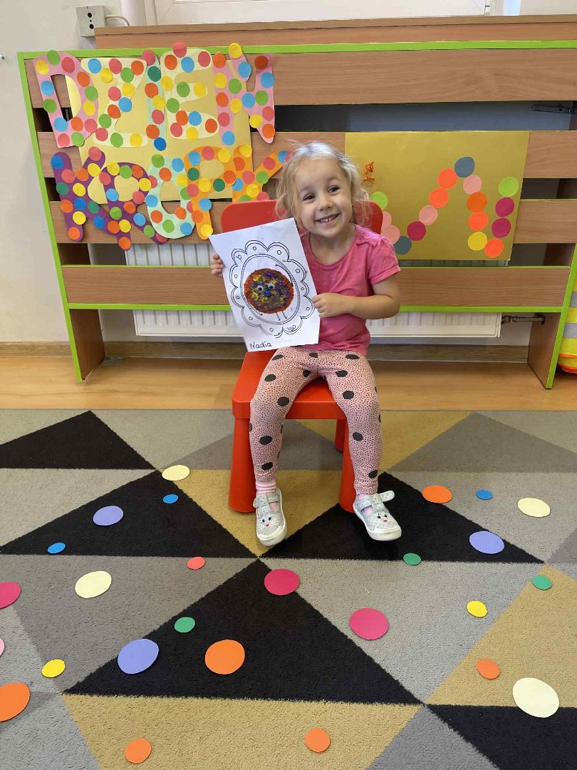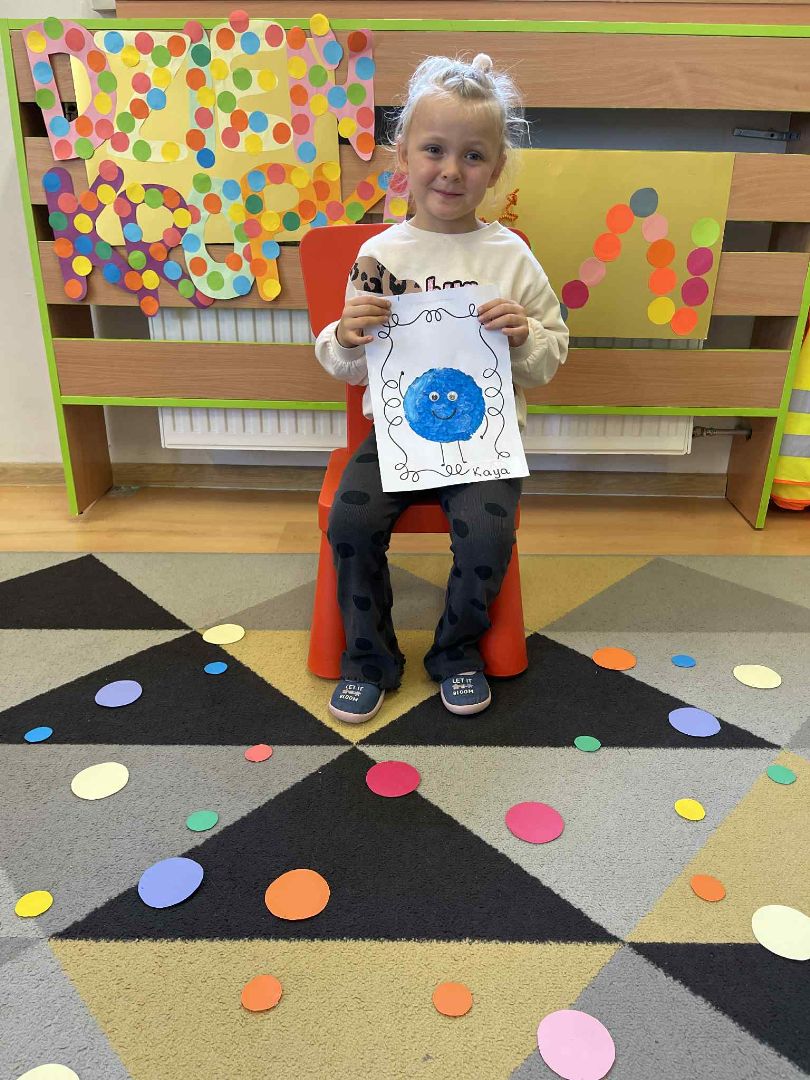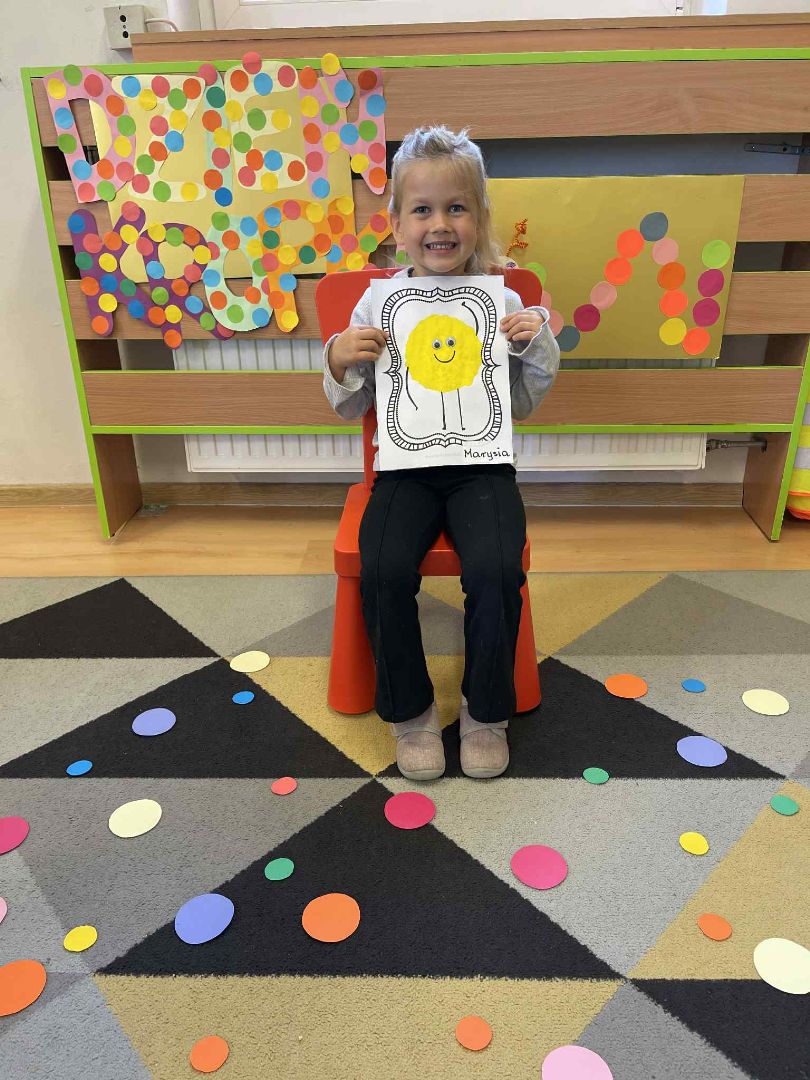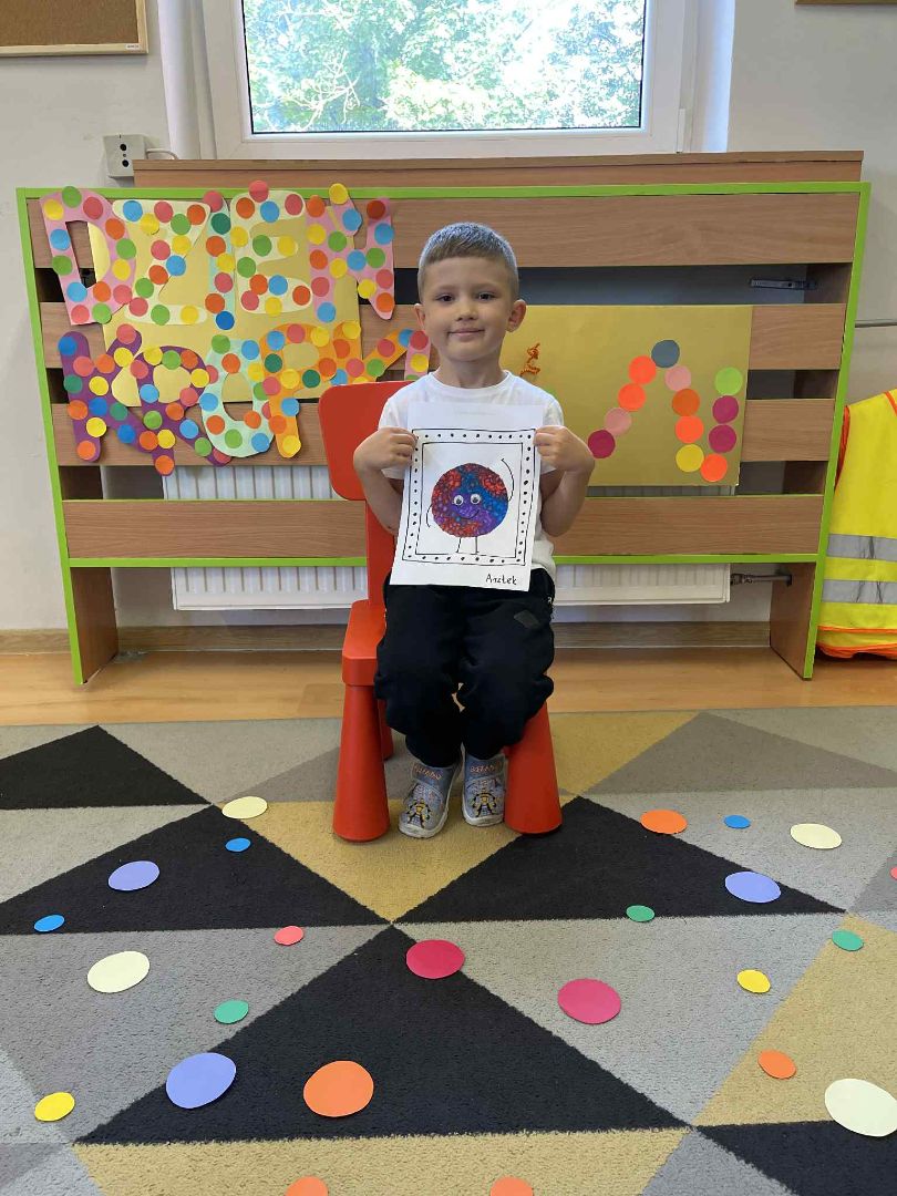 Dnia 15 września (poniedziałek) 2025 roku w naszej przedszkolnej grupie świętowaliśmy Międzynarodowy Dzień Kropki. Dzień rozpoczęliśmy od wysłuchania opowiadania pt. „Kropka” autorstwa Petera H. Reynoldsa. Na jego podstawie, układaliśmy plan wydarzeń, rozwijając przy tym mowę oraz umiejętność opowiadania. Bawiliśmy się przy piosence, a także braliśmy udział w zabawie rytmicznej do utworu pt. „Cuckoo Ritim”, rozwijając przy tym poczucie rytmu oraz koordynację ruchową oko – ręka. Na zakończenie, wykonaliśmy pracę plastyczną, malując pomponami zanurzonymi w farbie plakatowej. Każda kropka była wyjątkowa i niepowtarzalna.