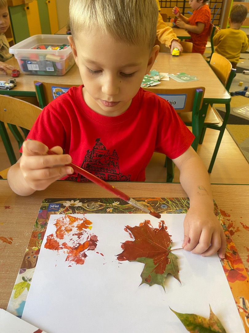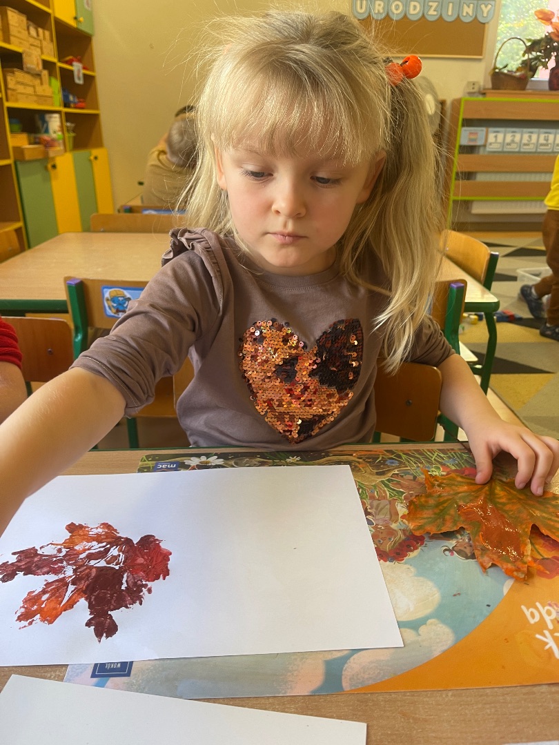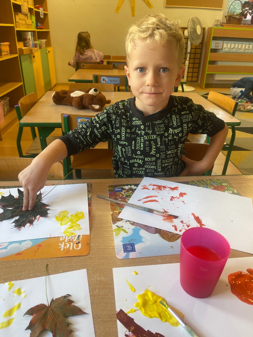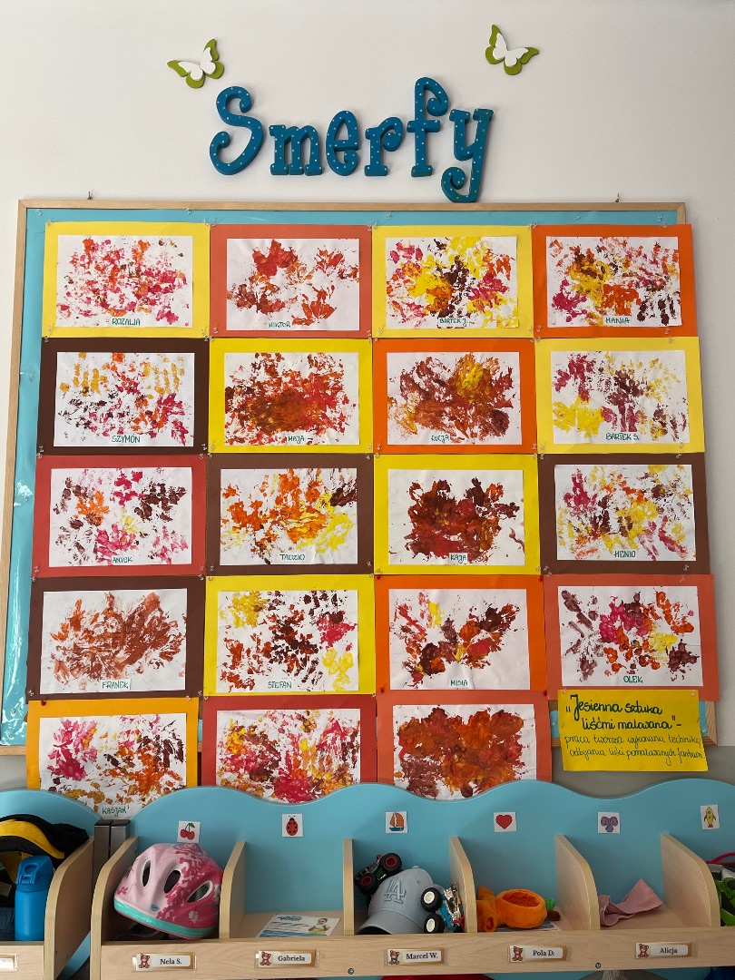 Indywidualna praca tw贸rcza wykonana technik膮 odbijania li艣ci pomalowanych farbami w barwach jesieni: 偶贸艂ci, pomara艅czy, czerwieni oraz br膮zu 馃帹 Prawdziwe, jesienne dzie艂a sztuki tworz膮 pi臋kn膮 dekoracj臋 na naszej grupowej tablicy 鈽猴笍