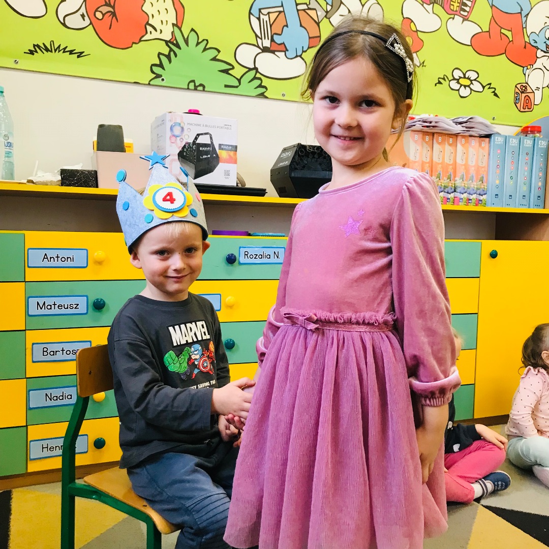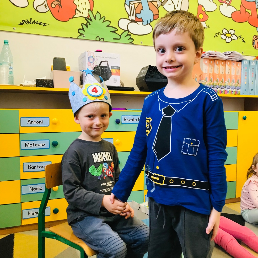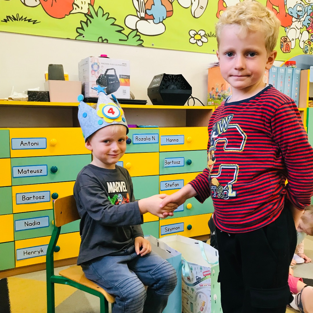 Dziś świętowaliśmy 4. urodziny Bartka! Bartek rozpoczął swoje urodziny, trzymając w rękach globus i obchodząc Słońce urodzinowe, pokazując wszystkim przedszkolakom na zdjęciach, jak wyglądał, gdy miał roczek, dwa, trzy i cztery latka. To była niezwykła podróż w czasie! Następnie, wspólnie zaśpiewaliśmy mu „Happy Birthday”, złożyliśmy serdeczne życzenia i rozpoczęliśmy urodzinową zabawę! Nie zabrakło baniek mydlanych, tańców i świetnej zabawy przy ulubionych piosenkach Bartka 🎵 Dziękujemy Rodzicom Bartka za przygotowanie upominków dla dzieci – sprawiły im ogromną radość! 🎁 Bartku, niech każdy dzień przynosi Ci radość, zabawę i niesamowite przygody! Odkrywaj świat z ciekawością! Bądź zawsze sobą – właśnie takiego Cię uwielbiamy! 💛Sto lat!