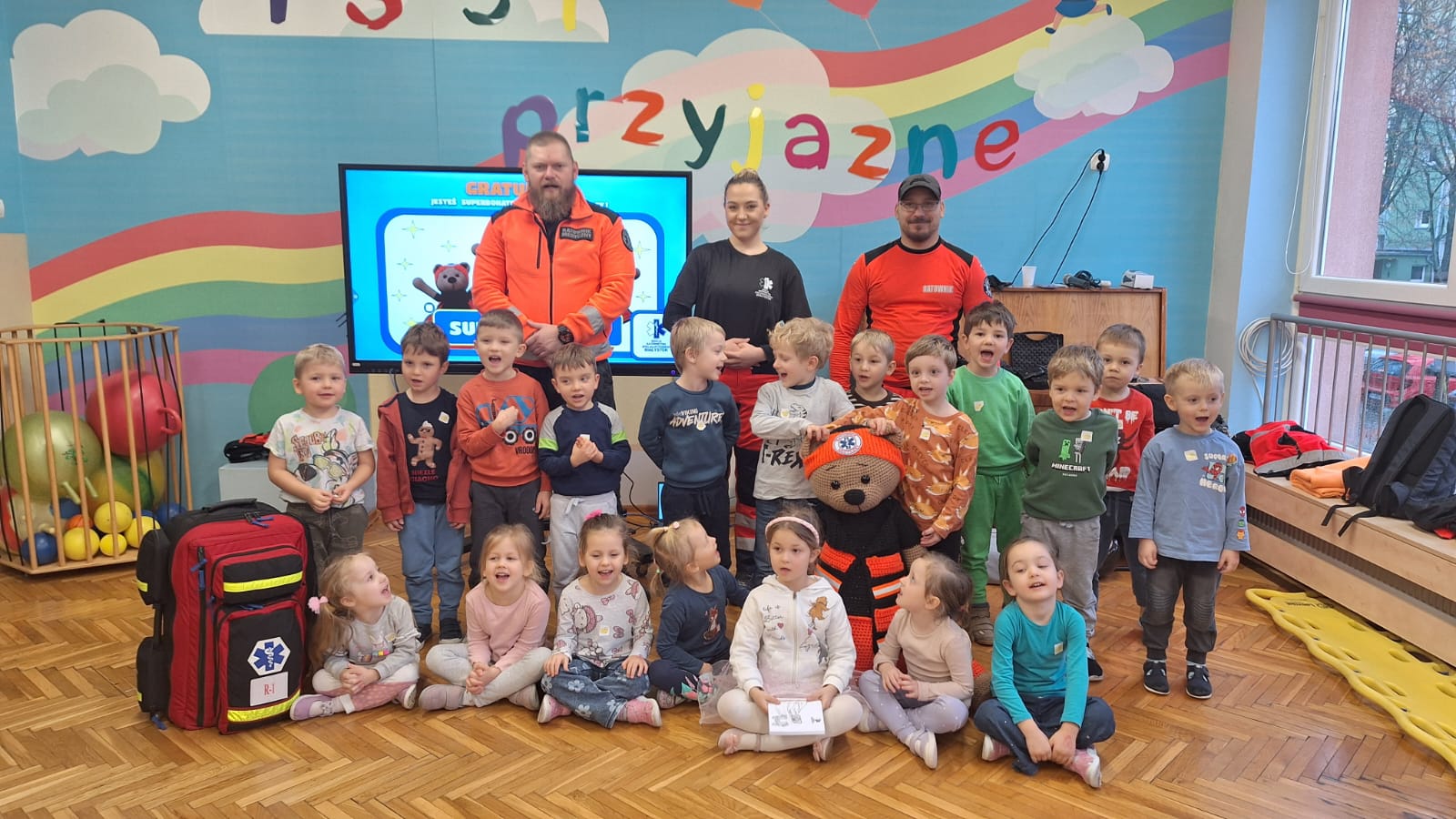 Dzi艣 w naszym przedszkolu odby艂o si臋 wyj膮tkowe spotkanie z ratownikami medycznymi. Przedszkolaki mog艂y pozna膰 wyposa偶enie apteczki, nauczy膰 si臋, jak uk艂ada膰 osob臋 poszkodowan膮 w pozycji bezpiecznej, a tak偶e jak udziela膰 resuscytacji kr膮偶eniowo-oddechowej (RKO). Utrwali艂y r贸wnie偶 znajomo艣膰 numeru alarmowego, kt贸ry wybieramy w sytuacjach zagro偶enia 偶ycia.