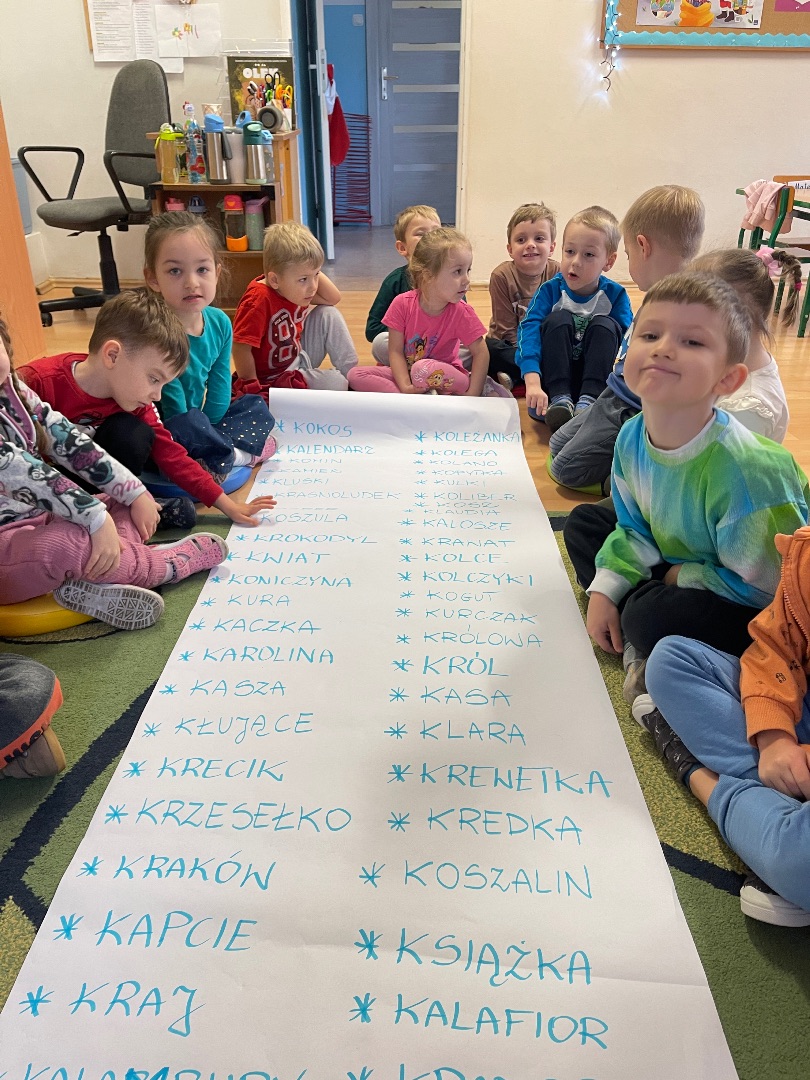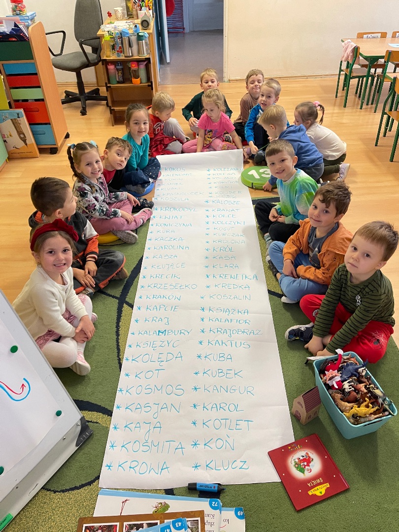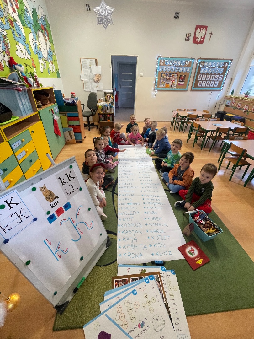 Podczas dzisiejszych zajęć dydaktycznych, przedszkolaki poznawały literkę „k”, rozwijały umiejętność wyodrębniania głoski „k” w nagłosie oraz wykonywały ćwiczenia z analizy i syntezy słuchowej. W dalszej części zajęć dydaktycznych, przedszkolaki poznawały wygląd małej i dużej literki „k” oraz „K” – drukowanej i pisanej. W ramach utrwalenia nowej literki przedszkolaki budowały także schemat wyrazu kot („K jak kot”), łącząc naukę liter z zabawą.