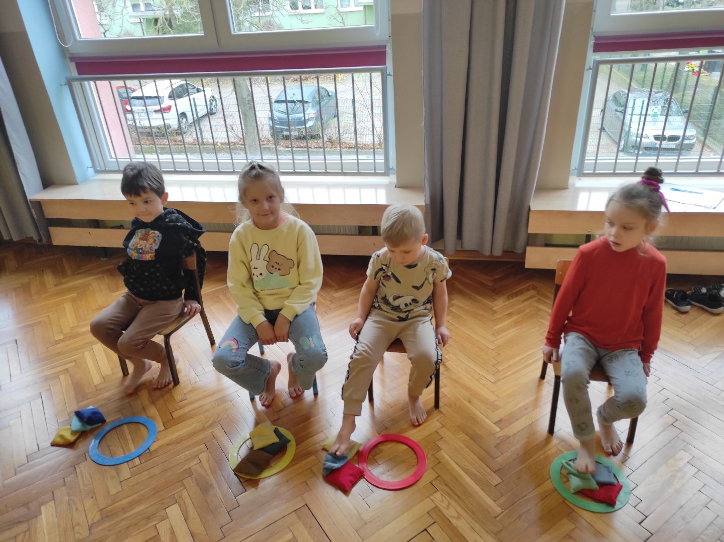 Dziś, przedszkolaki w ramach zajęć z pomocy psychologiczno-pedagogicznej, uczestniczyły w zajęciach z gimnastyki korekcyjnej, rozwijając przy tym ogólną sprawność ruchową oraz kształtując prawidłową postawę ciała.