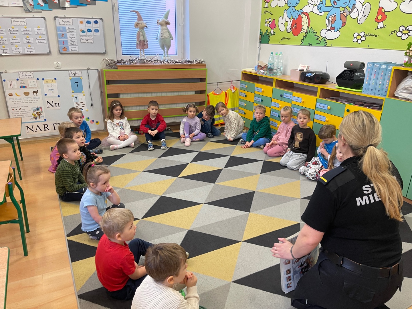 Dnia 27 stycznia (wtorek) dzieci z przedszkolnej grupy „Smerfy” uczestniczyły w spotkaniu poświęconym bezpiecznym zimowym zabawom ❄️⛄ Funkcjonariusze Straży Miejskiej przypomnieli dzieciom najważniejsze zasady bezpieczeństwa podczas zabaw na śniegu i lodzie – m.in. jak unikać poślizgnięć, jak zachowywać się na śliskich chodnikach oraz jak bezpiecznie zjeżdżać na sankach. Spotkanie miało na celu utrwalenie zasad bezpiecznej zabawy zimą na śniegu i lodzie. Dzieci chętnie uczestniczyły w rozmowie i krótkich zabawach edukacyjnych, zadawały pytania i utrwalały poznane zasady. Podczas wizyty dowiedziały się również, na czym polega praca strażnika miejskiego oraz w jakich sytuacjach można zwrócić się do niego o pomoc.