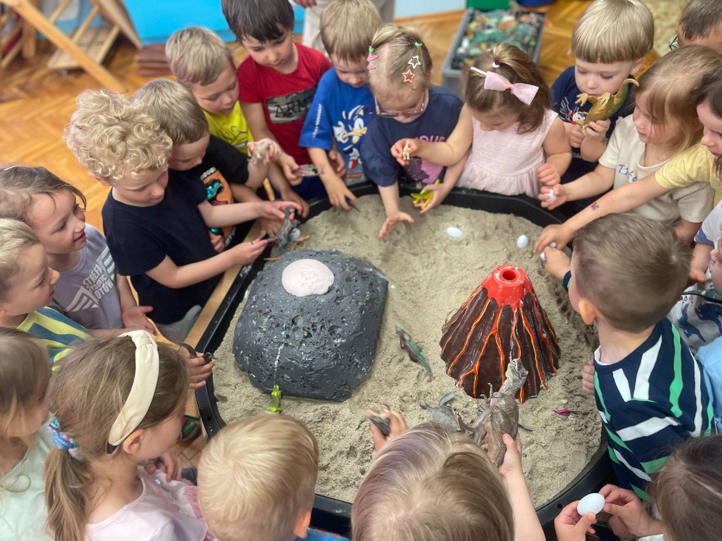 W czwartek, 29 maja, nasze przedszkolaki odbyły niezwykłą podróż w czasie – aż do epoki dinozaurów. Wszystko to za sprawą fascynujących warsztatów paleontologicznych, które przeniosły nas do świata ogromnych gadów, pradawnych tajemnic i prawdziwych skamieniałości. Przedszkolaki z ogromnym zainteresowaniem słuchały opowieści o różnych gatunkach dinozaurów i dowiadywały się, jak wyglądało życie na Ziemi miliony lat temu. Z zaciekawieniem poznawały także, czym zajmują się paleontolodzy i jak szukają śladów prehistorycznych stworzeń. Nie zabrakło też praktycznej części – przedszkolaki przeprowadziły eksperyment z płynem do naczyń i octem, tworząc efekt wybuchającego wulkanu, który pomógł im zrozumieć jedną z przyczyn wyginięcia dinozaurów. Dodatkowo, każdy przedszkolak mógł spróbować swoich sił w odkopywaniu „skamielin”, używając specjalnych narzędzi niczym prawdziwy odkrywca. Dinozaury zrobiły ogromne wrażenie, a niejedno dziecko poczuło się przez chwilę jak mały naukowiec z własną misją badawczą. Kto wie – może wśród naszych przedszkolaków rośnie przyszły paleontolog?🔍