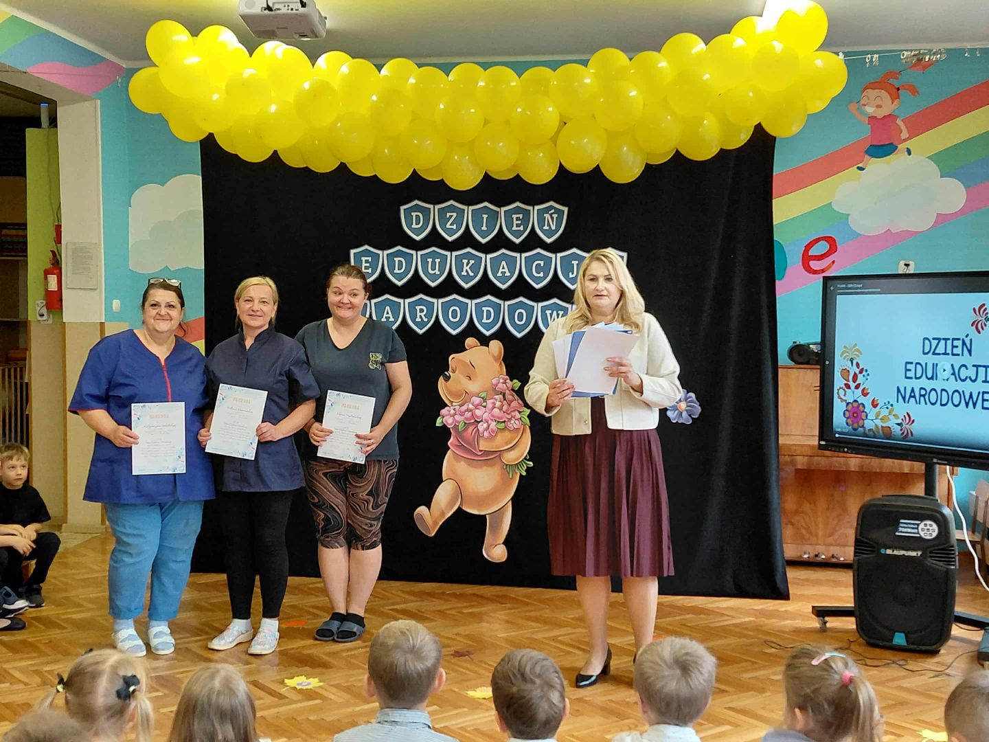 Dnia 14 października 2025 r. (wtorek) w naszym przedszkolu odbyła się uroczystość z okazji Dnia Edukacji Narodowej. W wydarzeniu wzięli udział pracownicy przedszkola, emerytowani nauczyciele i pracownicy przedszkola, a wśród nich szczególnie miło powitaliśmy panią Krystynę Winnicką – byłą Dyrektor Przedszkola Samorządowego nr 51. Nie zabrakło również naszych wspaniałych przedszkolaków. Podczas uroczystości, przedszkolaki zaprezentowały program artystyczny przygotowany z ogromnym zaangażowaniem i radością. Chór przedszkolny zaśpiewał piosenkę pt. „Jesienią” oraz zaprezentował taniec z chusteczkami. Przedszkolaki z grupy „Smerfy” przygotowały wyjątkową piosenkę, dedykowaną wszystkim pracownikom przedszkola – jako wyraz wdzięczności za codzienną pracę, cierpliwość i troskę o każde dziecko. Na zakończenie uroczystości chór wykonał wzruszający utwór pt. „Czerwone róże dla mojej Pani”, a wybrane przedszkolaki wręczały czerwone róże z bibuły wszystkim pracownikom oraz emerytowanym już pracownikom przedszkola. Ten piękny gest wywołał wiele radości i wzruszeń, a ciepła, życzliwa atmosfera udzieliła się wszystkim obecnym. Dzień Edukacji Narodowej w naszym przedszkolu przyniósł nam wiele pięknych chwil, które na długo pozostaną w naszej pamięci i sercach.