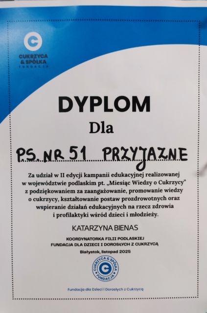 Nasze przedszkole wzięło udział w II edycji kampanii edukacyjnej realizowanej w województwie podlaskim „Miesiąc Wiedzy o Cukrzycy”.