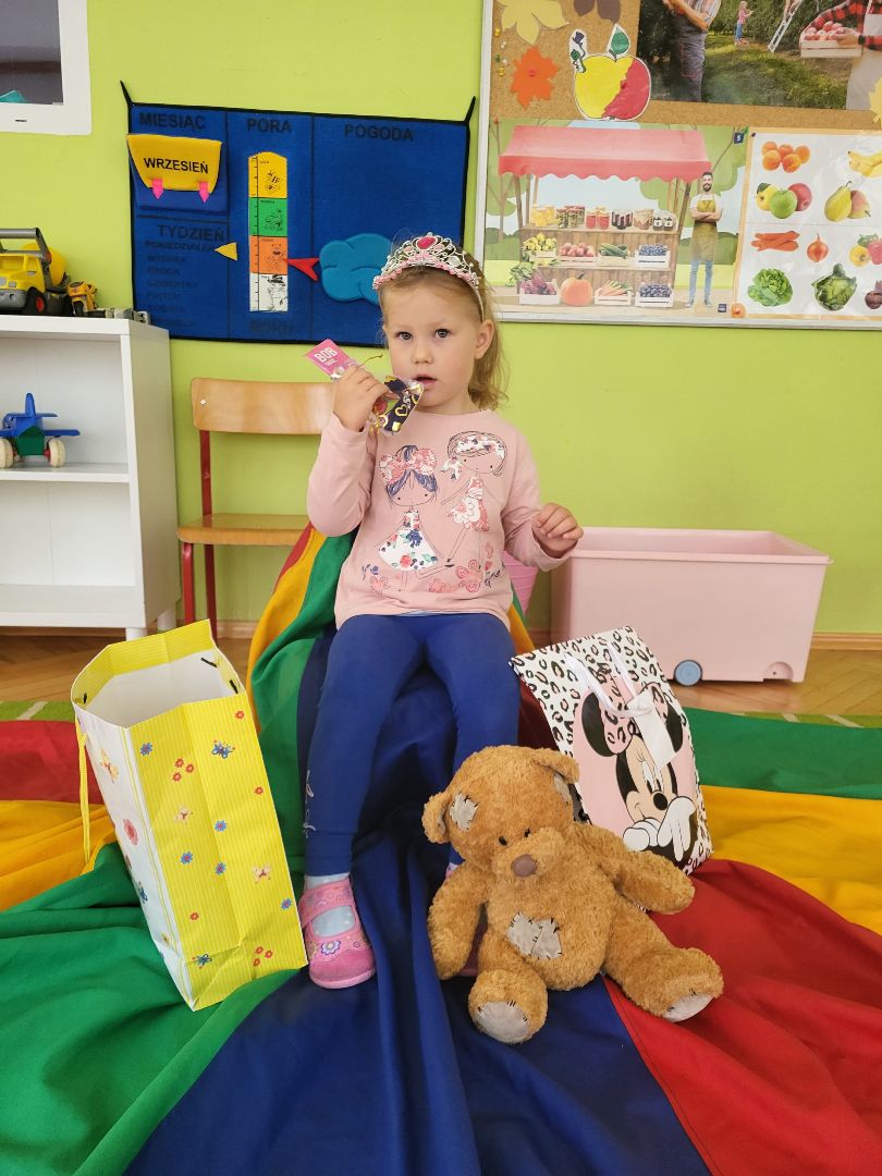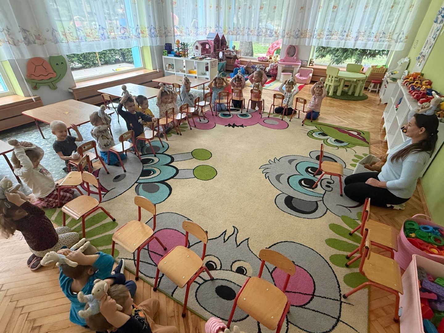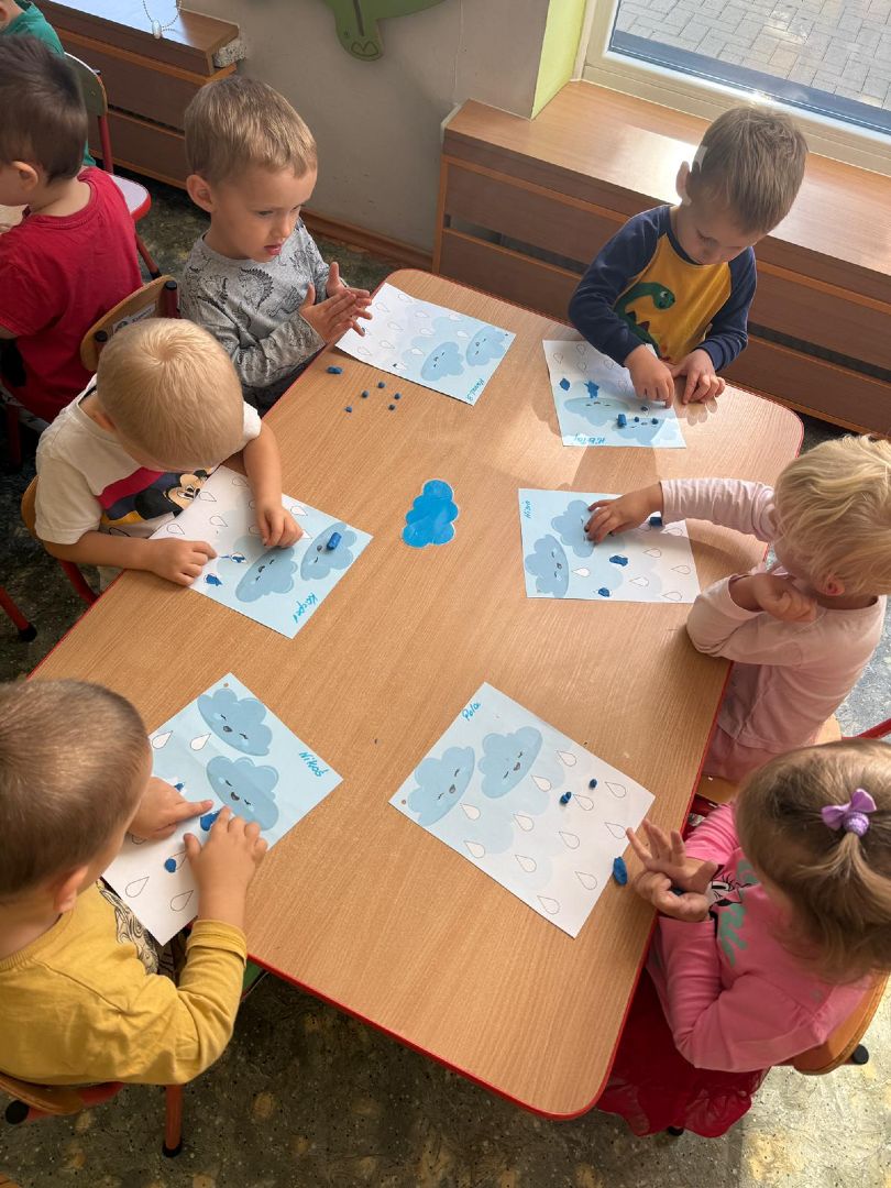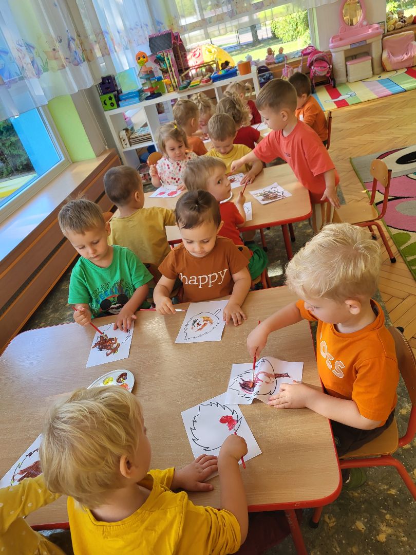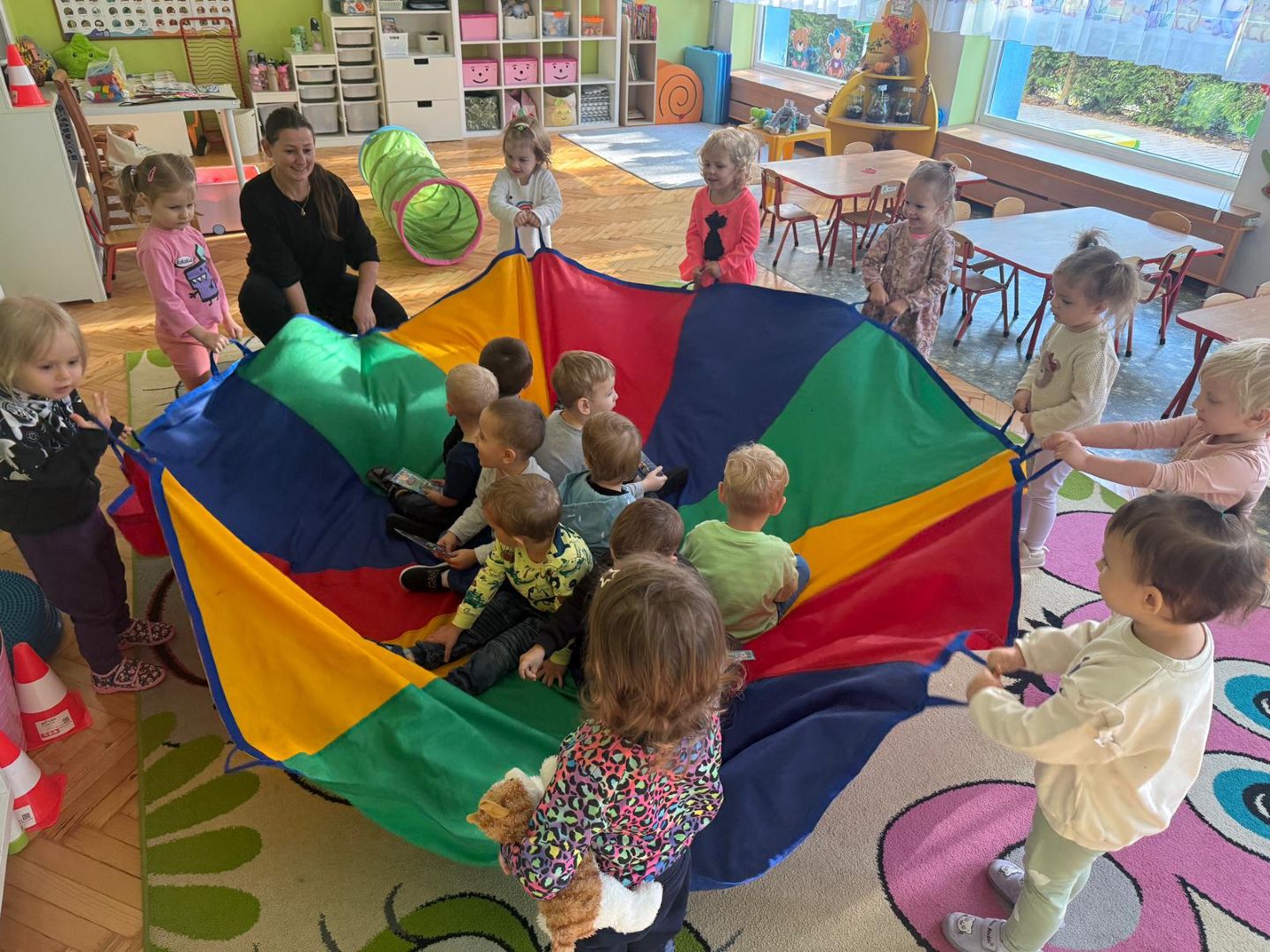 z okazji pierwszego dnia jesieni dzieci bawiły się przy muzyce chustą animacyjną, naśladowały spadające liście przy muzyce A. Vivaldiego - Jesień z kolorowymi chustkami oraz tworzyły barwne prace plastyczne malując jesienne liście farbami.🍁🍂🍁
